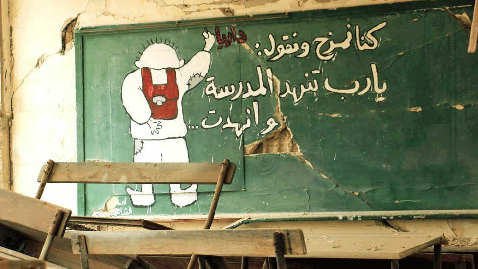 Αυτή η τοιχογραφία είναι από ένα βομβαρδισμένο σχολείο. Ο μαθητής γράφει «Κάναμε πλάκα και λέγαμε, Θεέ μου κατάστρεψε το σχολείο.. κι αυτό το έκανε»