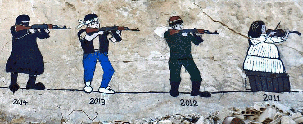 Τοιχογραφία που δείχνει τις αλλαγές στον τρόπο επανάστασης από ειρηνικές διαδηλώσεις (2011), στις καθεστωτικές δυνάμεις (2012), στο αντάρτικο (2013) και τελικά στην ανάδυση του Ισλαμικού Κράτους (2014)