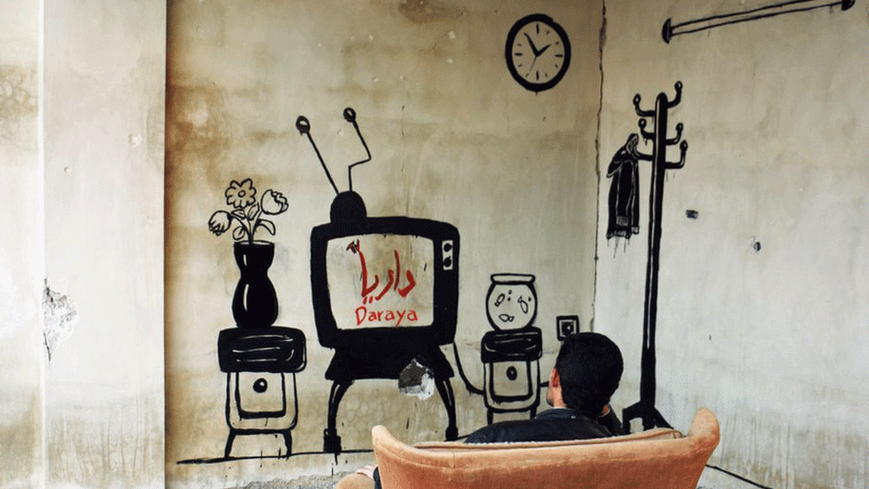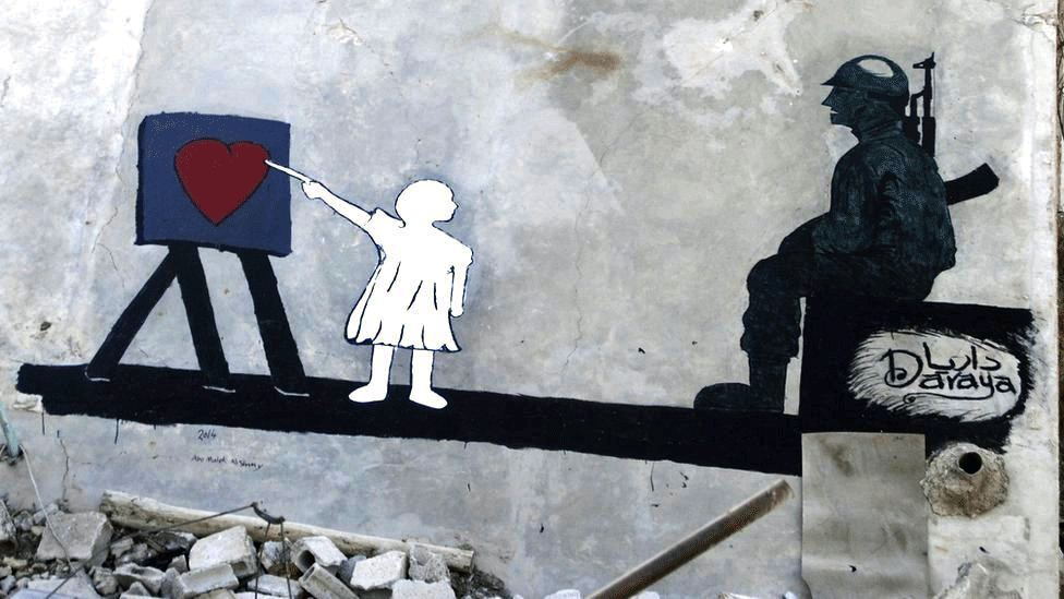 Καθώς ένα προάστιο της Δαμασκού δεχόταν συνεχόμενες βομαβαρδιστικές επιθέσεις και υπέφερε από μια χρόνια έλλειψη τροφίμων, νερού και ηλεκτρικού, εμφανίστηκε ξαφνικά μια επιβλητική τοιχογραφία στον τοίχο ενός βομβαρδισμένου κτηρίου.