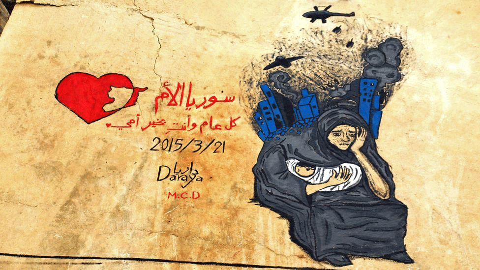 Η τοιχογραφία σχολιάζει ειρωνικά τη μέρα της μητέρας που γιορτάζεται στη Συρία στις 21 Μαρτίου λέγοντας «Χαρούμενη Μέρα της Μητέρας»