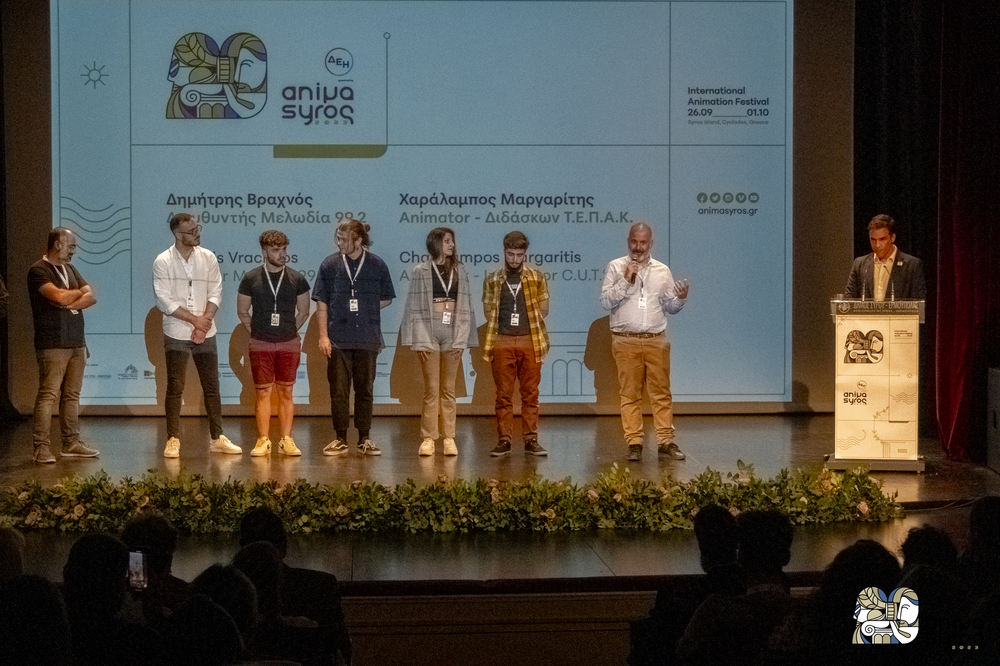 Ακολούθησε η προβολή της ταινίας μικρού μήκους “Ενενήντα δεύτερα για τον Μάνο Λοΐζο”. Πρόκειται για την τέταρτη ταινία της σειράς “Ενενήντα Δεύτερα”, σε συνεργασία με τον ραδιοφωνικό σταθμό Μελωδία 99,2, στο πλαίσιο της οποίας η ζωή πολυαγαπημένων Ελλήνων τραγουδοποιών και τραγουδιστών που έχουν αφήσει εποχή στην ιστορία του ελληνικού τραγουδιού πλαισιωμένη από ένα εμβληματικό τραγούδι τους γίνεται ταινία ανιμέισον από ανερχόμενους σκηνοθέτες. Αυτή τη φορά, το animated biopic είναι αφιερωμένο στον μεγάλο μουσικοσυνθέτη Μάνο Λοΐζο και χαρτογραφεί με χρήση μικτών τεχνικών ανιμέισον τις σημαντικές στιγμές της ζωής και του έργου του μέσα από το αξέχαστο τραγούδι “Όλα σε θυμίζουν” και την τρυφερά επιβλητική απαγγελία της Χάρις Αλεξίου. Η αγαπημένη ερμηνεύτρια μπορεί να μην κατάφερε να βρίσκεται στη Σύρο για την προβολή, απηύθυνε όμως χαιρετισμό μέσω video δηλώνοντας σχετικά: “Χαίρομαι πάρα πολύ γιατί, μέσα από το ANIMASYROS και την τέχνη του ανιμέισον, ένας τόσο σημαντικός συνθέτης όπως ο Μάνος Λοϊζος θα ταξιδέψει σε ολόκληρο τον κόσμο! Εύχομαι να απολαύσετε κι εσείς αυτά τα “Ενενήντα δεύτερα” όσο τα απόλαυσα κι εγώ…”. Αμέσως μετά, ο Βασίλης Κ. Καραμητσάνης κάλεσε στη σκηνή τον Δημήτρη Βραχνό, διευθυντή του Μελωδία 99,2, και τον Χαράλαμπο Μαργαρίτη, animator και διδάσκοντα στο Τμήμα Πολυμέσων Γραφικών Τεχνών του Τεχνολογικού Πανεπιστημίου Κύπρου μαζί με τους έξι σπουδαστές του που υπογράφουν την ταινία, για να μιλήσουν για το όλο εγχείρημα.