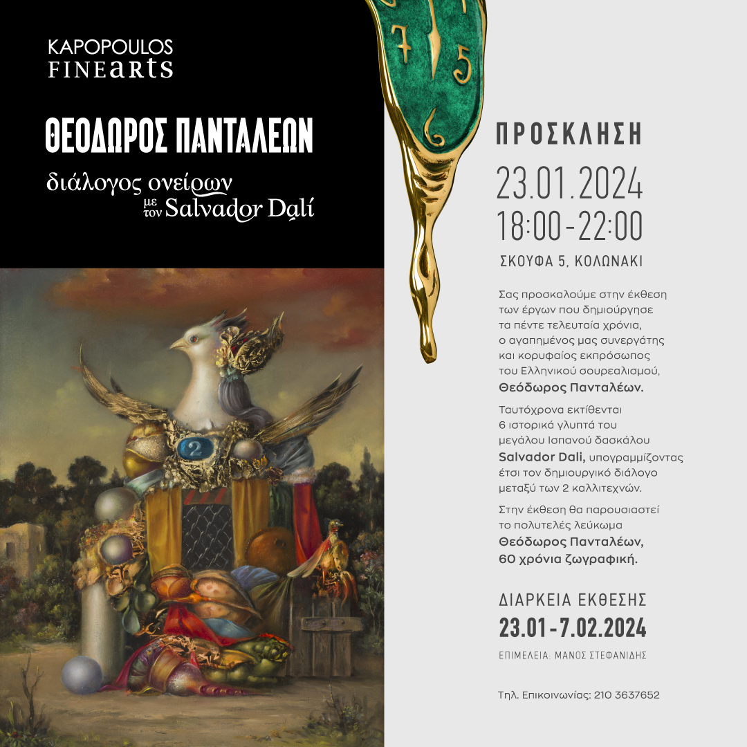 Με χαρά και συγκίνηση, η γκαλερί Kapopoulos Fine Arts παρουσιάζει τα έργα που φιλοτέχνησε κατά τη διάρκεια των πέντε τελευταίων χρόνων ο αγαπημένος της συνεργάτης και κορυφαίος εκπρόσωπος του Ελληνικού σουρεαλισμού, Θεόδωρος Πανταλέων. Η έκθεση με τίτλο «Θεόδωρος Πανταλέων, διάλογος Ονείρων με τον Salvador Dali» εγκαινιάζεται την Τρίτη 23 Ιανουαρίου (18:00 – 22:00) στην γκαλερί Kapopoulos Fine Arts στην οδό Σκουφά 5 στο Κολωνάκι, σε επιμέλεια του ιστορικού τέχνης, καθηγητή Μάνου Στεφανίδη.