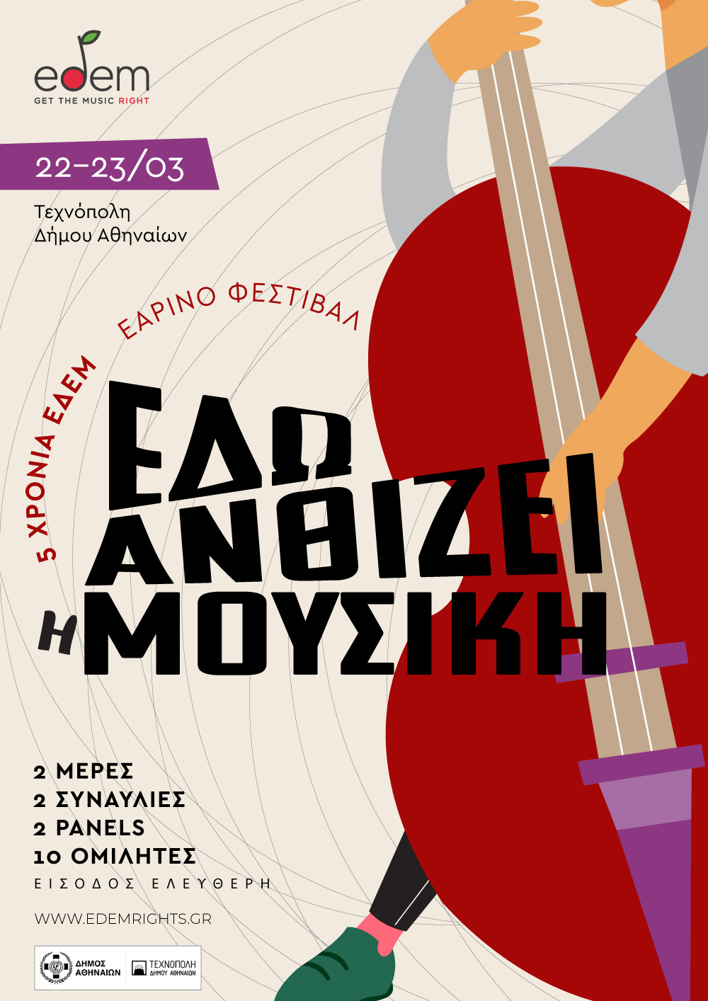 Με αφορμή τη συμπλήρωση 5 χρόνων λειτουργίας, η ΕΔΕΜ, διοργανώνει το εαρινό μουσικό φεστιβάλ «Εδώ ανθίζει η μουσική», που θα πραγματοποιηθεί στις 22 και 23 Μαρτίου 2025 στην Τεχνόπολη Δήμου Αθηναίων. Ένα διήμερο γεμάτο μουσική και συζητήσεις, με στόχο την ανάδειξη θεμάτων που αφορούν στη μουσική δημιουργία όπως η σύγχρονη μουσική πραγματικότητα στην εποχή της Τεχνητής Νοημοσύνης, η διαχρονικότητα της μουσικής δημιουργίας: τραγούδι, χορός, θέατρο & μουσικά σχολεία.