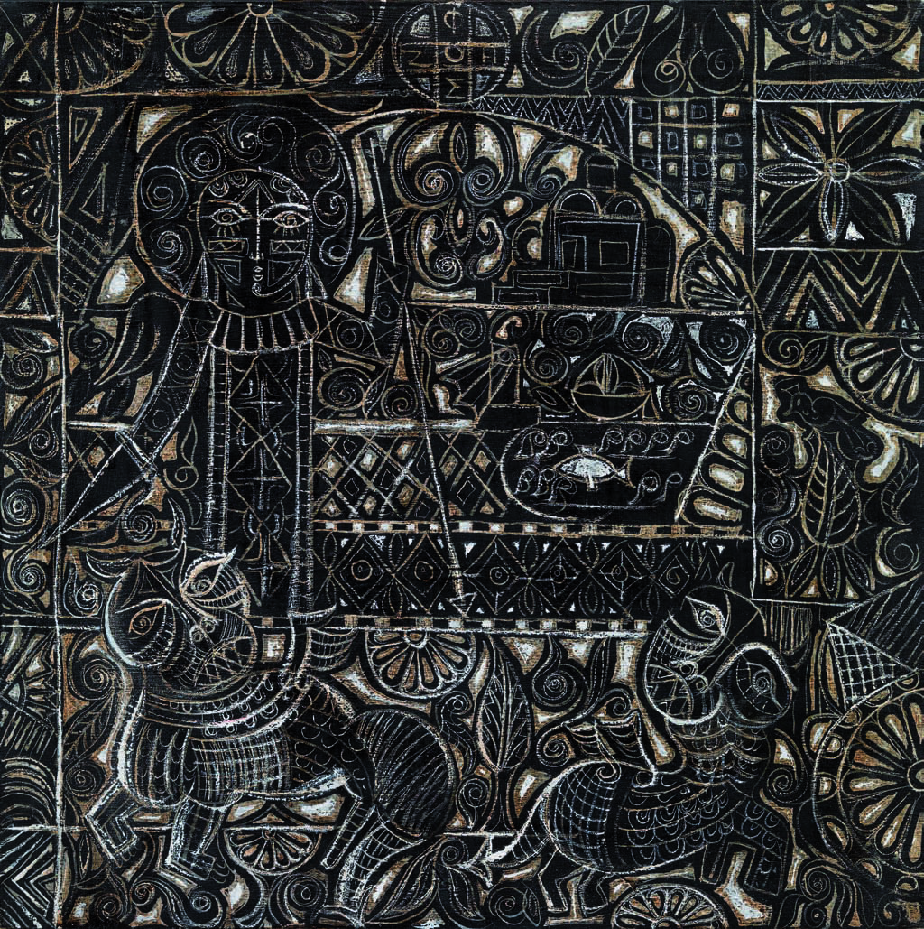 Ο Ebenezer Nana Bruce εστιάζει στη γυναικεία προσωπογραφία με ένα έργο εντυπωσιακών φωτεινών χρωμάτων και υπερφυσικών διαστάσεων. Η γυναικεία μορφή αναδύεται μετωπικά μέσα από το μονόχρωμο επίπεδο φόντο με παχιές πινελιές και αποκρυσταλλώνεται σαν ένα πλάσμα πέρα από τα εγκόσμια. Ο τίτλος του έργου Yellow Shawl καταδεικνύει την απόσταση ανάμεσα στην γυναίκα και την εμφάνισή της, και επομένως αναδεικνύει την πραγματικότητα της υπόστασή της πέρα από τις θρησκευτικές της πεποιθήσεις, την κοινωνική της θέση ή το προσωπικό της γούστο.