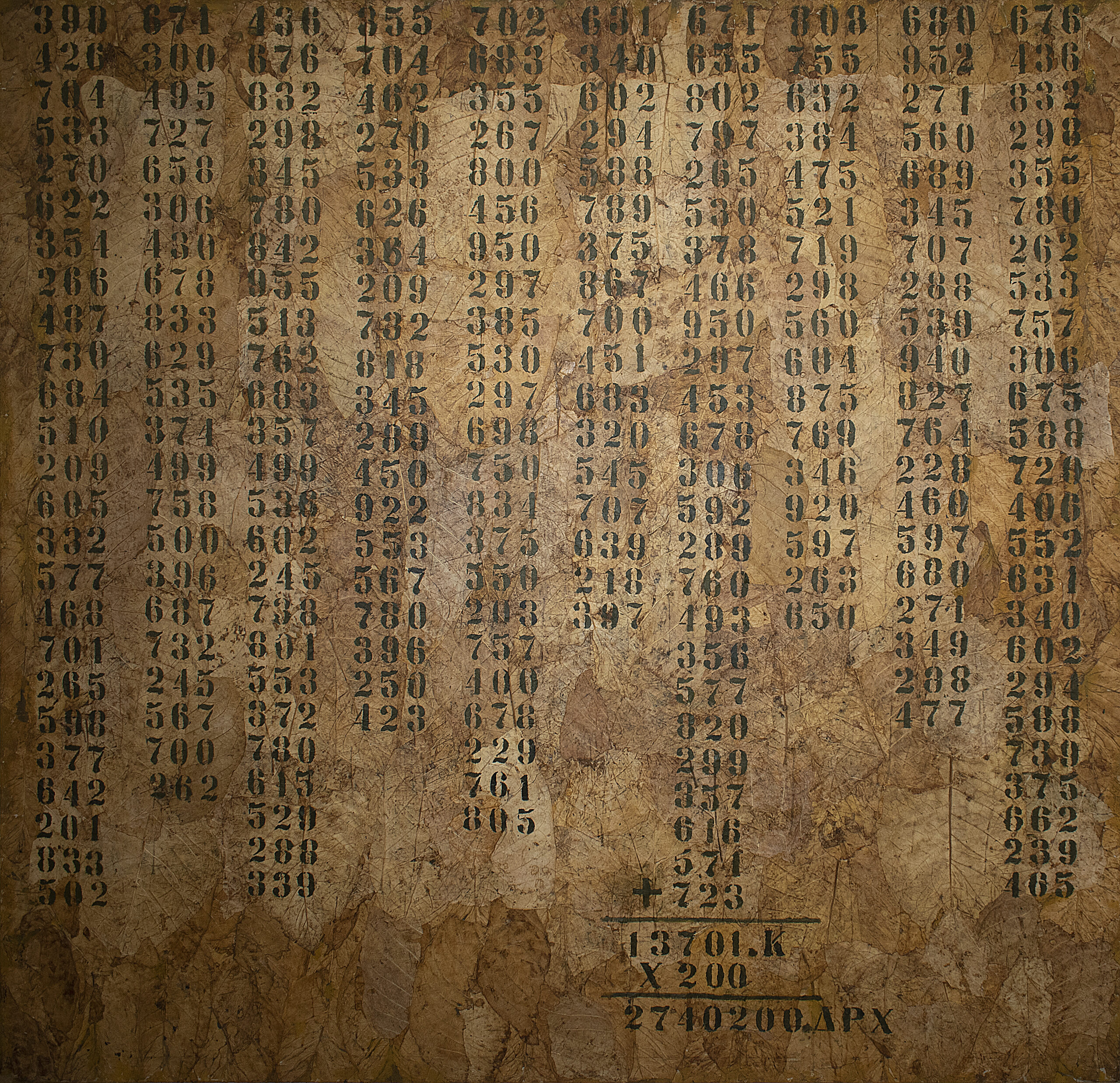 Η σειρά έργων Tobacco Archive του Πάνου Χαραλάμπους ( ο οποίος παρουσιάζει έως τις 31 Οκτωβρίου τα “Επιγραφόμενα” και στο Αρχαιολογικό Μουσείο Πόρου) λειτουργεί σαν ένα κολάζ υλικών διανοητικών τοπίων, “στεγνών κήπων”, που μαρτυρούν μια παραγωγική και οικονομική δύναμη που άκμασε στην Ελλάδα, αλλά τον τελευταίο μισό αιώνα έχει αργοσβήσει. Ο καλλιτέχνης ζωγραφίζει / επιγράφει, αριθμούς, λογαριασμούς, και ημερομηνίες σε φύλλα καπνού για να φέρει στο προσκήνιο την καθημερινή εργασία των ελλήνων καπνοκαλλιεργητών, τον σωματικό και πνευματικό μόχθο πίσω από την καλλιέργεια, την επεξεργασία, την παραγωγή και την εμπορία του προϊόντος, κύριου μέσου επιβίωσης και ευημερίας.