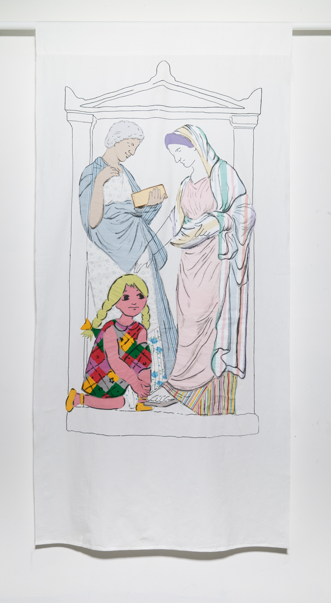 Παράλληλα, στον χώρο της Υποδοχής του ΚΠΙΣΝ θα παρουσιαστεί το έργο Αμεινόκλεια, βασισμένο σε επιτύμβια στήλη από τον Κεραμεικό. Η επιτύμβια αναφορά, με τη σκηνή της Αμεινόκλειας πλαισιωμένης από γυναικείες μορφές σε μια στιγμή καθημερινότητας και πένθους, λειτουργεί σε άμεση εννοιολογική συνομιλία με τα «δάκρυα» της περφόρμανς. Το πένθος, ως ιδιωτική αλλά και συλλογική εμπειρία, διατρέχει και τα δύο έργα, υπογραμμίζοντας τη διαχρονικότητα των έμφυλων ρόλων και των κοινωνικών προσδοκιών που εγγράφονται στα σώματα των γυναικών. Η μικρή Άννα, από το «Αλφαβητάριον» σε εικονογράφηση Κώστα Γραμματόπουλου, μια επανερχόμενη φιγούρα στο έργο της Λαλέ, λειτουργεί ως γέφυρα ανάμεσα στις γενιές, διατηρώντας ζωντανό το νήμα της μνήμης.