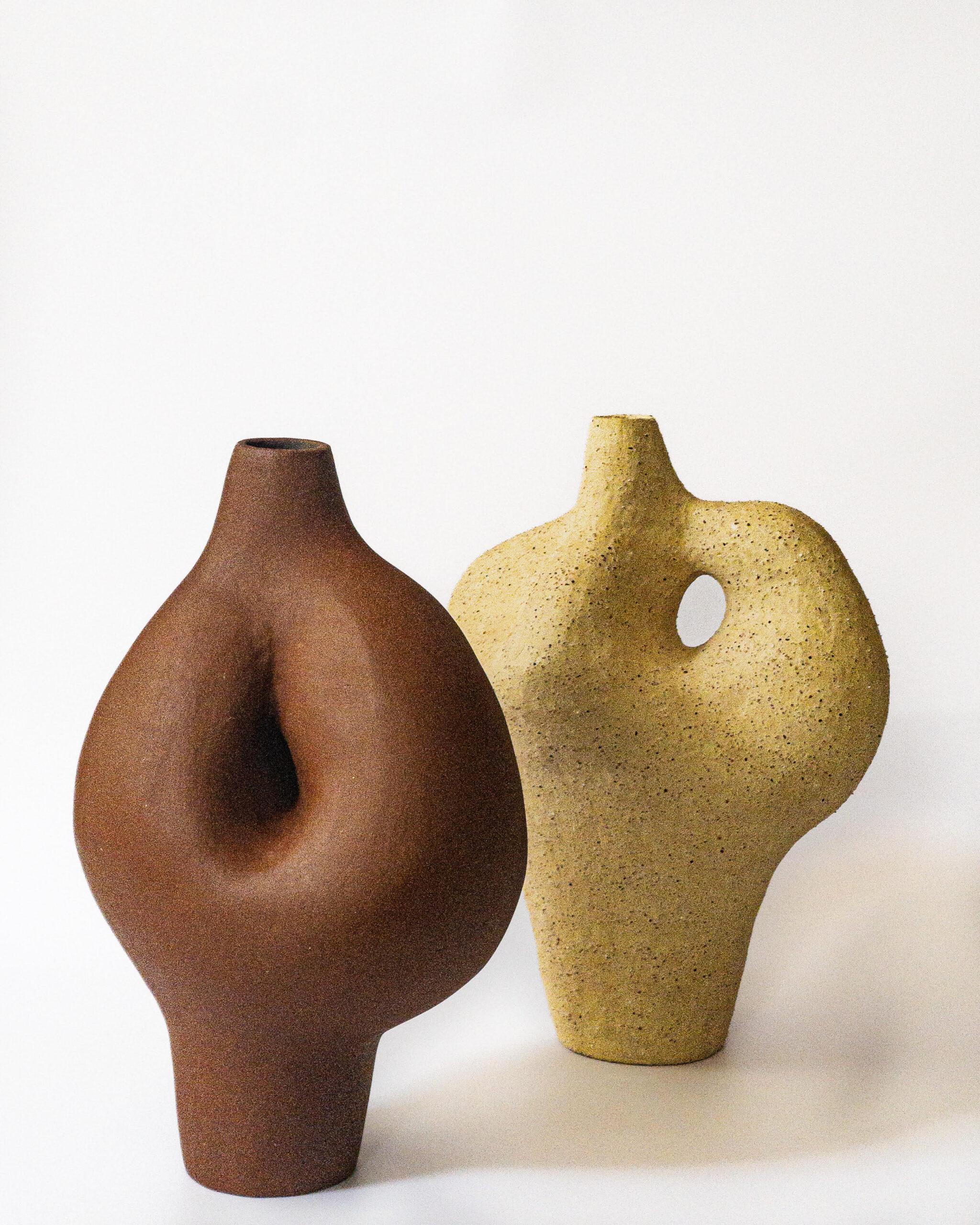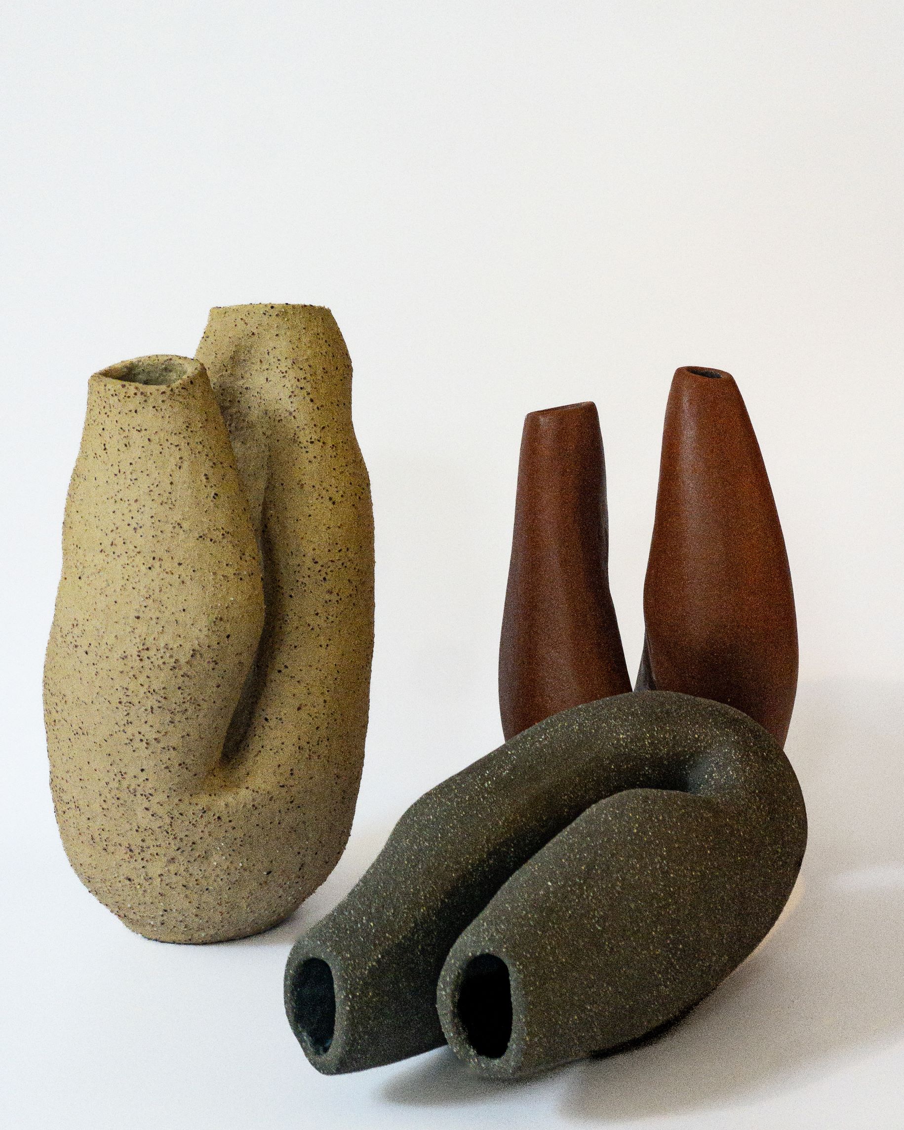 Τα έργα που εκτίθενται χαρακτηρίζονται από μεγάλες φόρμες και γήινα χρώματα, με πηλό που ψήνεται σε υψηλές θερμοκρασίες για να αναδεικνύονται ενδιαφέρουσες υφές και χρώματα. “Ήθελα οι φόρμες να μιλούν από μόνες τους, γι’ αυτό δεν πρόσθεσα πολύ χρώμα”, συμπληρώνει. “Έχω προσθέσει μόνο ένα ηφαιστειακό γυάλωμα σε ορισμένα κομμάτια, το οποίο προσθέτει μια άλλη ενδιαφέρουσα υφή. Πέρασα όλα τα κομμάτια με κερί μέλισσας, κάνοντας τα χρώματα ζεστά και ζωντανά”.