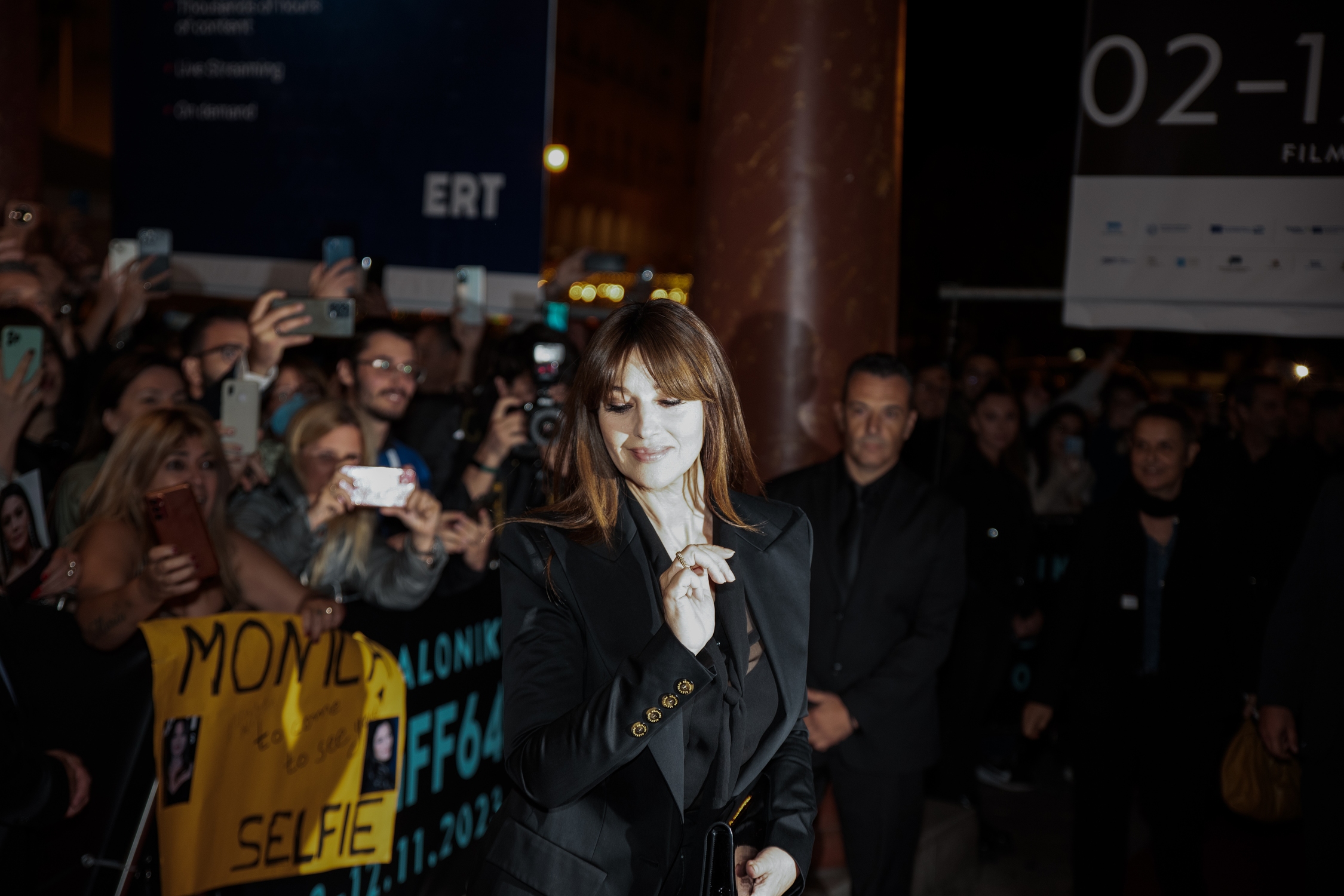 Εν μέσω επιφωνημάτων, φλας και εκφράσεων λατρείας, η Μόνικα Μπελούτσι περπατά, χαιρετά ευγενικά τον κόσμο και στέλνει ένα φιλί στον αέρα.