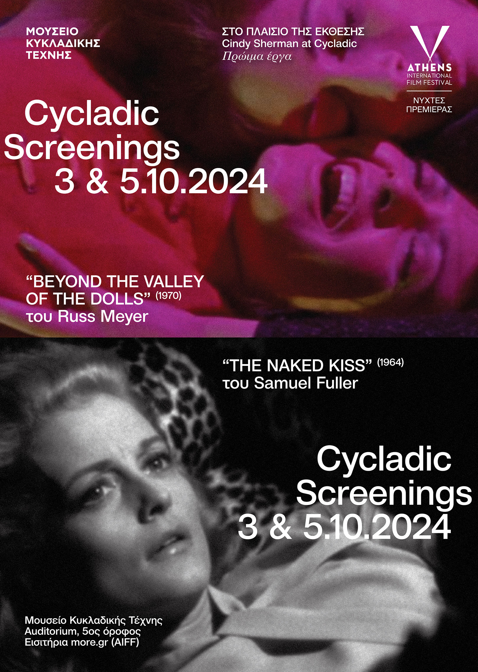 Στο πλαίσιο της έκθεσης Cindy Sherman at Cycladic: Πρώιμα έργα που ολοκληρώνεται στις 4 Νοεμβρίου, το Μουσείο Κυκλαδικής Τέχνης συνεργάζεται με το 30ό Διεθνές Φεστιβάλ Κινηματογράφου της Αθήνας Νύχτες Πρεμιέρας και διοργανώνει τα Cycladic Screenings στις 3 και 5 Οκτωβρίου 2024. Πρόκειται για την προβολή δύο κινηματογραφικών ταινιών που επέλεξε η ίδια η Cindy Sherman ως πηγή έμπνευσης για τη δημιουργία μιας σειράς φωτογραφικών της έργων, μεγάλο μέρος των οποίων παρουσιάζονται στο πλαίσιο της έκθεσής της στο Μουσείο Κυκλαδικής Τέχνης. Οι θεατές θα έχουν τη δυνατότητα να δουν την ίδια μέρα μία ή και τις δύο ταινίες και παράλληλα να περιηγηθούν στην έκθεση.