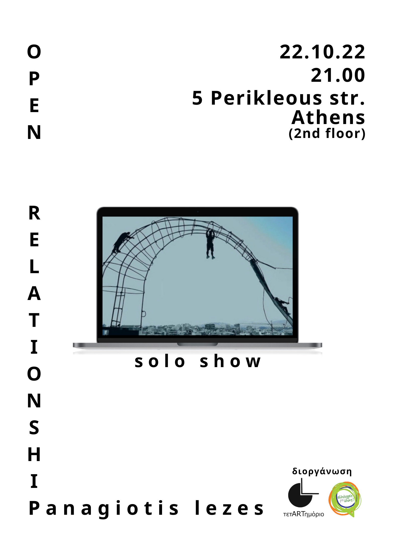 Το τετARTημόριο και η «Αλληλεγγύη για Όλους», μας προσκαλούν το Σάββατο 22 Οκτωβρίου στις 21:00, στην εικαστική δράση του Παναγιώτη Λεζέ, με τίτλο Open Relationship. Περικλέους 5, Αθήνα (3 στενά από το metro Συντάγματος) δεύτερος όροφος.