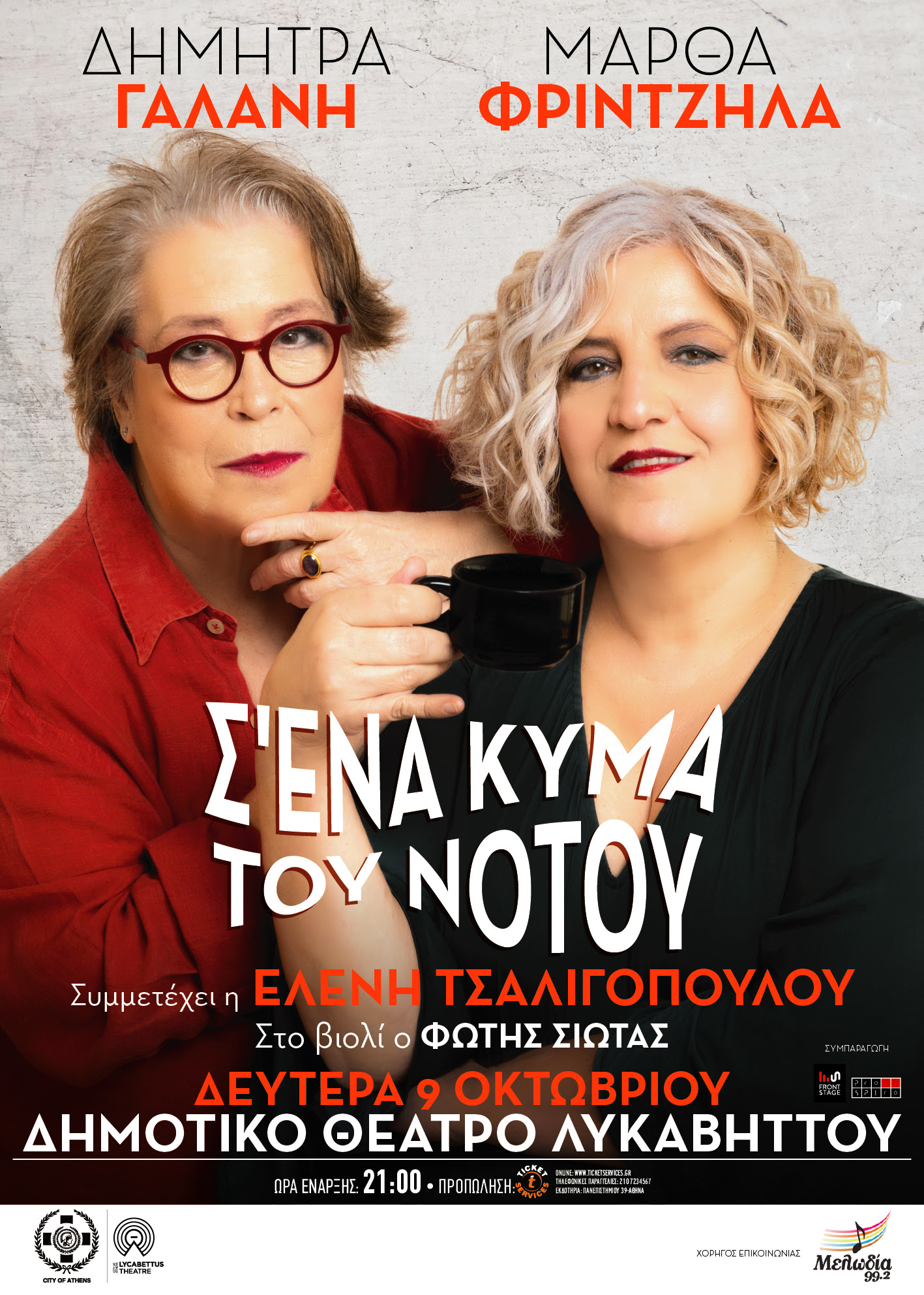 H Δήμητρα Γαλάνη και η Μάρθα Φριντζήλα τη Δευτέρα 9 Οκτωβρίου, σε συνέχεια των δύο sold out εμφανίσεών τους στο Μέγαρο Μουσικής Αθηνών, έρχονται πάνω «Σ’ ένα κύμα του Νότου» στο Δημοτικό Θέατρο Λυκαβηττού για ένα ακόμα συναρπαστικό μουσικό ταξίδι, αυτή τη φορά με θέα την πόλη από ψηλά. Στο ανανεωμένο, ιστορικό ανοιχτό θέατρο, οι δύο ερμηνεύτριες υπόσχονται λίγο καλοκαίρι ακόμα και μας προσκαλούν να τραγουδήσουμε μαζί τους διαχρονικά τραγούδια και διασκευές με νέα προσέγγιση, μέσα από την πρωτότυπη ματιά των ταλαντούχων μουσικών που τις πλαισιώνουν.