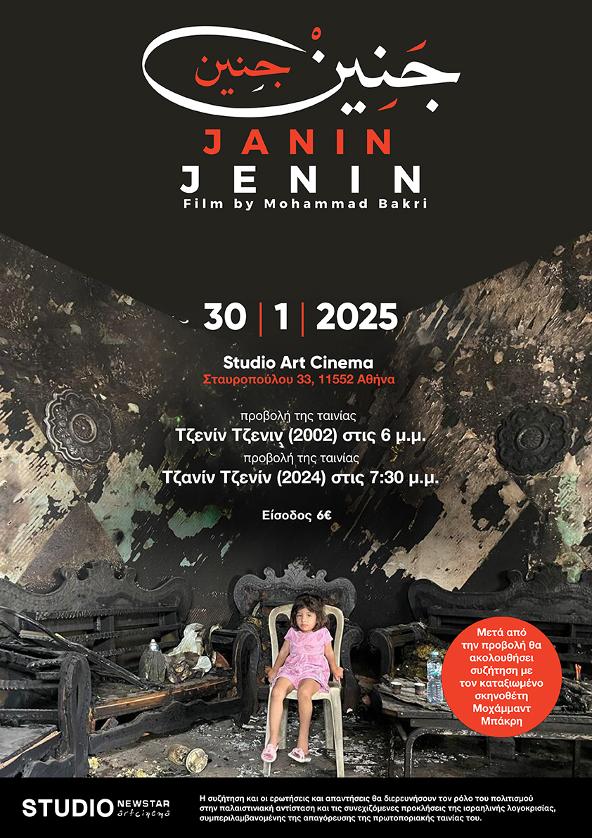 Διπλή προβολή των ταινιών Jenin Jenin (2002) και Janin Jenin (2024) και στη συνέχεια συζήτηση με τον σκηνοθέτη Mohammad  Bakri για τις νομικές και πολιτικές επιθέσεις που αντιμετώπισε κατά την καταστολή και των δύο ταινιών. Ο κατακτητής έχει επιτεθεί στις τέχνες και τους πολιτιστικούς παραγωγούς καθ’ όλη τη διάρκεια της κατοχής της Παλαιστίνης που διαρκεί δεκαετίες. Στην τρέχουσα γενοκτονία στη Γάζα, εκατοντάδες, αν όχι χιλιάδες πολιτιστικοί εργάτες έχουν δολοφονηθεί σκόπιμα. Η συζήτηση θα εμβαθύνει στο ρόλο των τεχνών σε έναν εθνικοαπελευθερωτικό αγώνα και στις προσπάθειες των κατακτητών να φιμώσουν την παλαιστινιακή ιστορία.