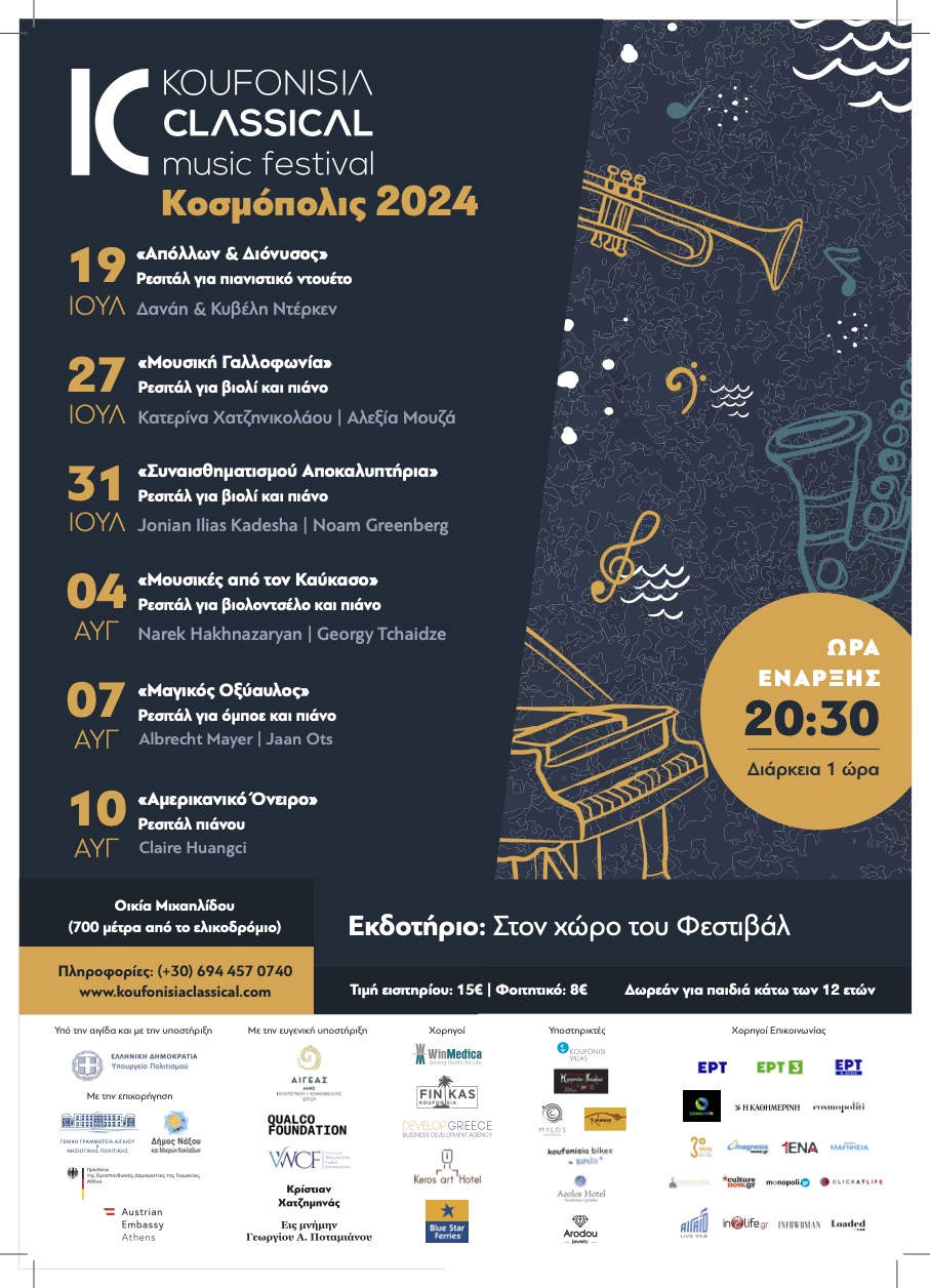 Για ένατη συνεχή χρονιά, το Φεστιβάλ Κλασικής Μουσικής Κουφονησίων συνεχίζει να ενώνει τη Δύση με την Ανατολή και το Βορρά με το Νότο και το παρελθόν με το μέλλον. Εξέχοντες καλλιτέχνες, με μουσικές επιλογές , υπό την καλλιτεχνική επιμέλεια του ιδρυτή του, μαέστρου και πιανίστα Κορνήλιου Μιχαηλίδη, διατηρεί την υψηλή καλλιτεχνική ποιότητα για την οποία διακρίνεται όλα αυτά τα χρόνια, συμβάλλοντας ώστε τα Κουφονήσια να αποτελούν ένα διεθνές σημείο συνάντησης. Εξέχοντες καλλιτέχνες, με μουσικές επιλογές από τον Καύκασο της Ασίας, την Κεντρική και Νότια Ευρώπη, τα Βαλκάνια και την Αμερική, πρωταγωνιστούν σε αυτή την κοσμοπολίτικη και εορταστική συνεύρεση.
