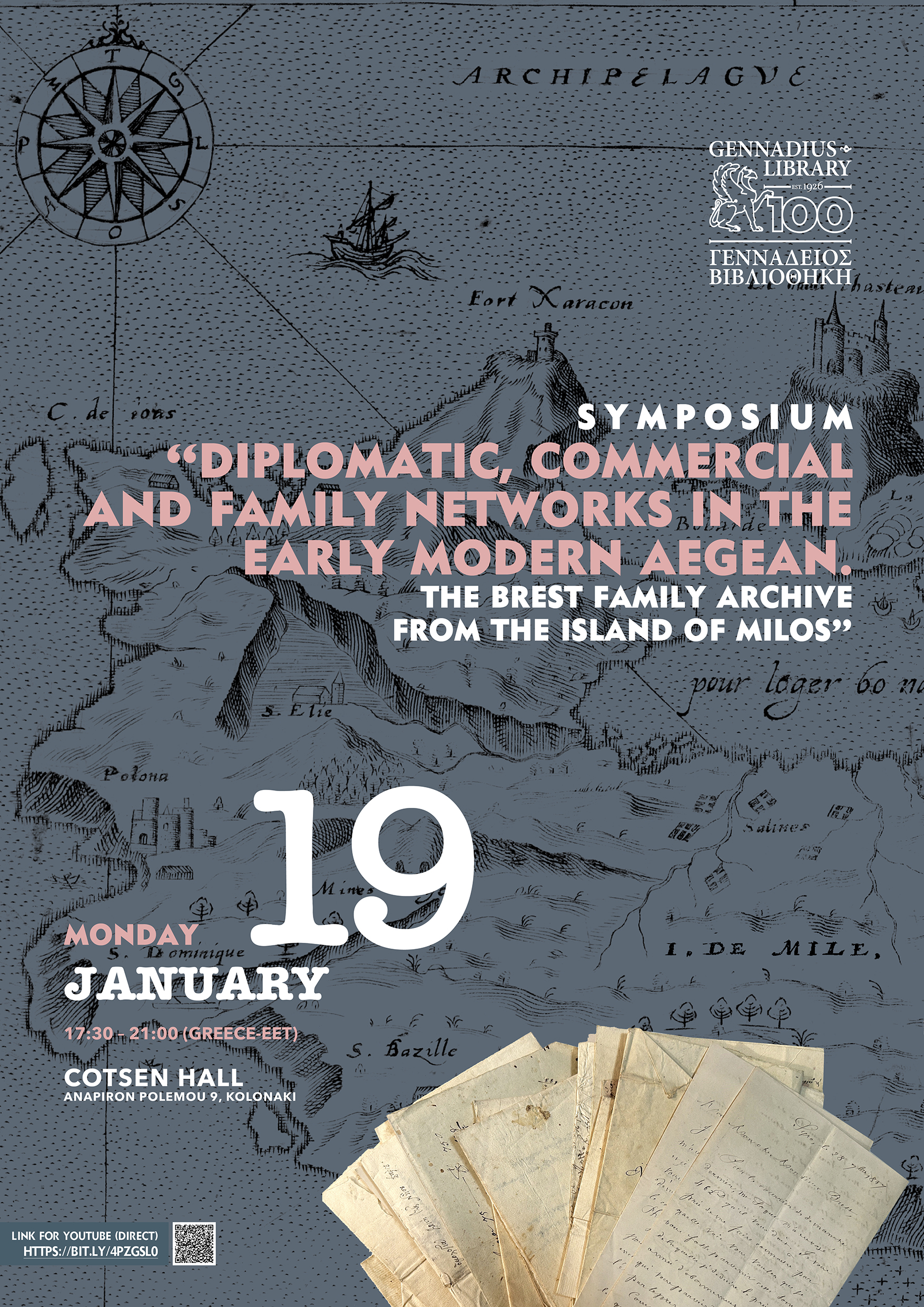 Η Γεννάδειος Βιβλιοθήκη της Αμερικανικής Σχολής Κλασικών Σπουδών στην Αθήνα, από τα σπουδαιότερα πολιτιστικά ιδρύματα της Ελλάδας, είναι κάτι πολύ περισσότερο από ένα αποθετήριο βιβλίων. Είναι ένας ζωντανός οργανισμός μάθησης, δημιουργικότητας και διαπολιτισμικού διαλόγου — ένας χώρος όπου η ιστορία εμπνέει το παρόν και το μέλλον. Το 2026 αποτελεί ορόσημο στη ζωή της, καθώς συμπληρώνονται 100 χρόνια από την ίδρυσή της. Στο πλαίσιο των εορτασμών για την επέτειο αυτή, η Γεννάδειος διοργανώνει συνέδριο με θέμα “Diplomatic, Commercial and Family Networks in the Early Modern Aegean. The Brest Family Archive from the Island of Milos” [Διπλωματικά, εμπορικά και οικογενειακά δίκτυα στο Αιγαίο κατά την πρώιμη νεωτερική περίοδο. Το αρχείο της οικογένειας Μπρεστ από το νησί της Μήλου]. Η εκδήλωση θα πραγματοποιηθεί τη Δευτέρα, 19 Ιανουαρίου από τις 5.30μμ έως τις 9.00μμ στο αμφιθέατρο Cotsen (Αναπήρων Πολέμου 9, Αθήνα) με ελεύθερη είσοδο για το κοινό.
