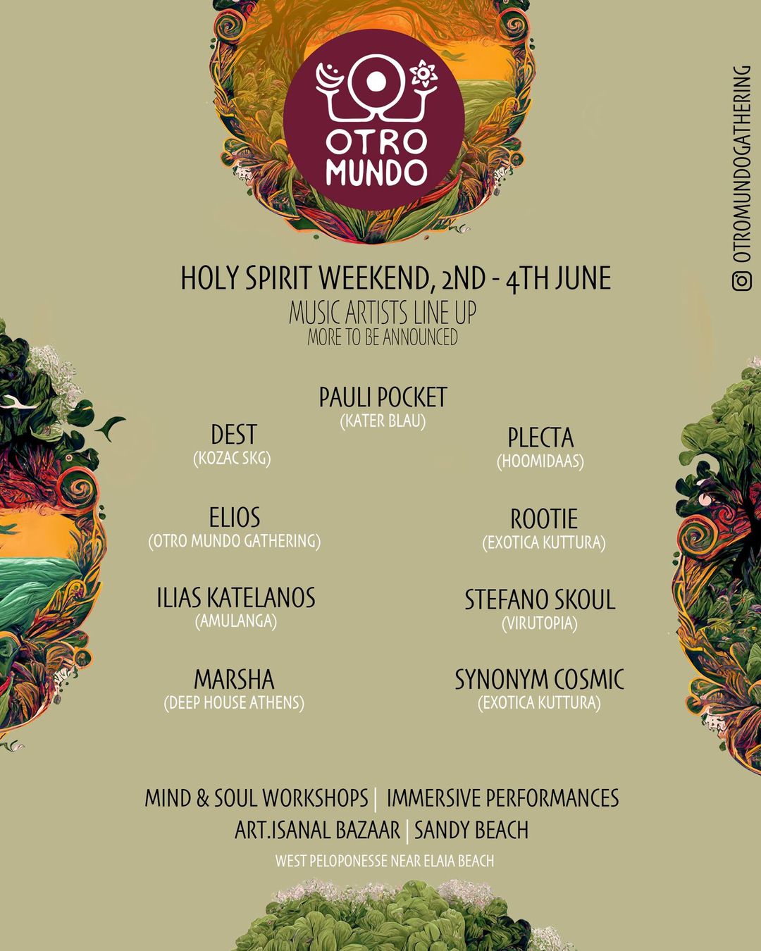 Το OTRO MUNDO θα αποτελέσει ένα ηχητικό ταξίδι μέσω ενός μουσικού τριήμερου σε ήχους απο World Electronica, Downtempo, Deep Organic House, Progressive, Tech House και Melodic Techno, θα αφυπνίσει σώμα και πνεύμα.