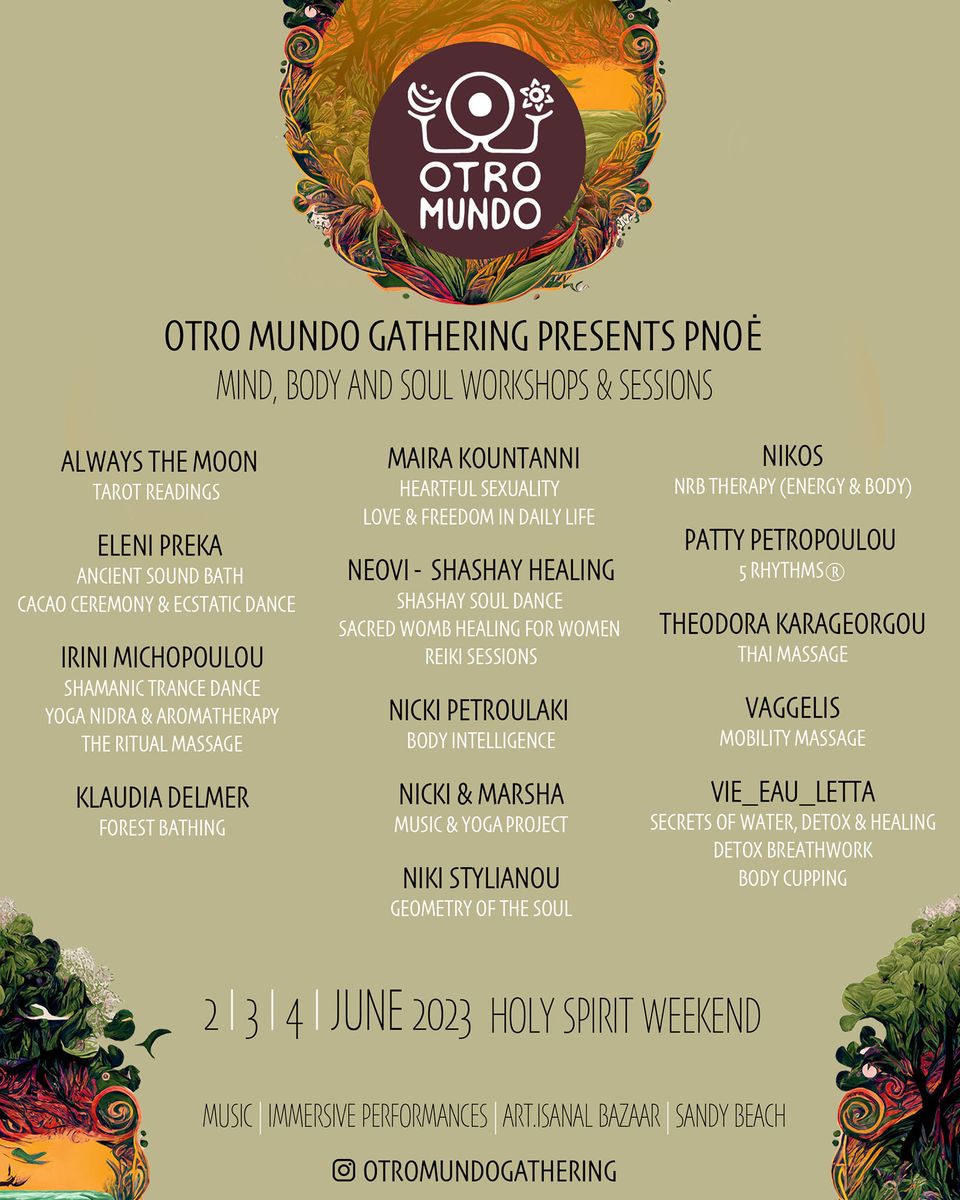 Μια σειρά απο εναλλακτικούς εκπαιδευτές και θεραπευτές, θα συμμετέχουν χαρίζοντας ένα μοναδικό τριήμερο πνευματικής ευεξίας, σύνδεσης και αφύπνησης, και θα παρουσιάσουν ένα πλούσιο πρόγραμμα ‘Pnoé’ με βιωματικά εργαστήρια και πρακτικές ενσυνeiδητότητας και ‘εσωτερικών’ εμπειριών με σκοπό να αφυπνήσουν το μυαλό και τις αισθήσεις όπως και να προκαλέσουν βαθιά σκέψη.