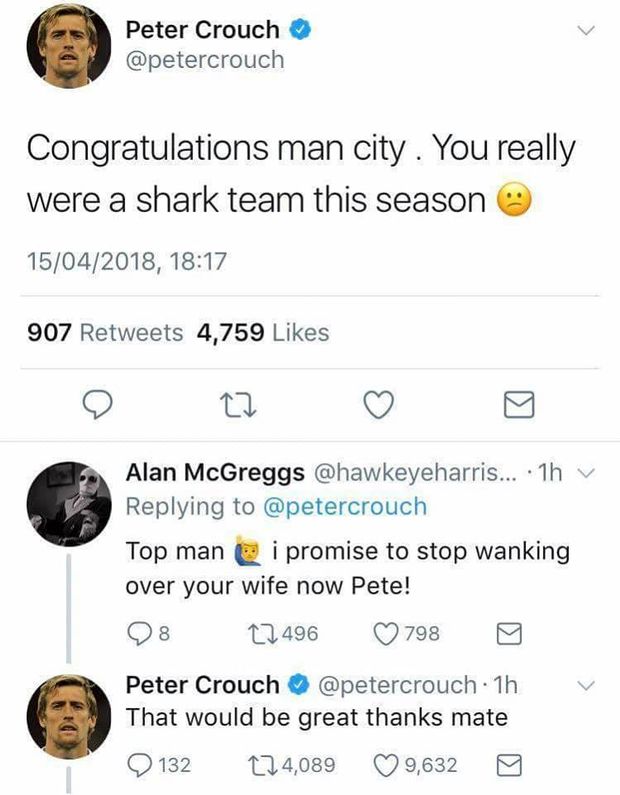 Ένας, όχι και τόσο φανατικός θαυμαστής των “Πολιτών”, ο Πίτερ Κράουτς, μέσω του λογαριασμού του στο twitter έδωσε τα εύσημα στην ομάδα του Πεπ Γκουαρδιόλα, με έναν τύπο -μάλλον οπαδό της Σίτι- να του απαντάει ότι μετά από αυτό το σχόλιο θα σταματήσει να… αυνανίζεται και να σκέφτεται τη γυναίκα του!