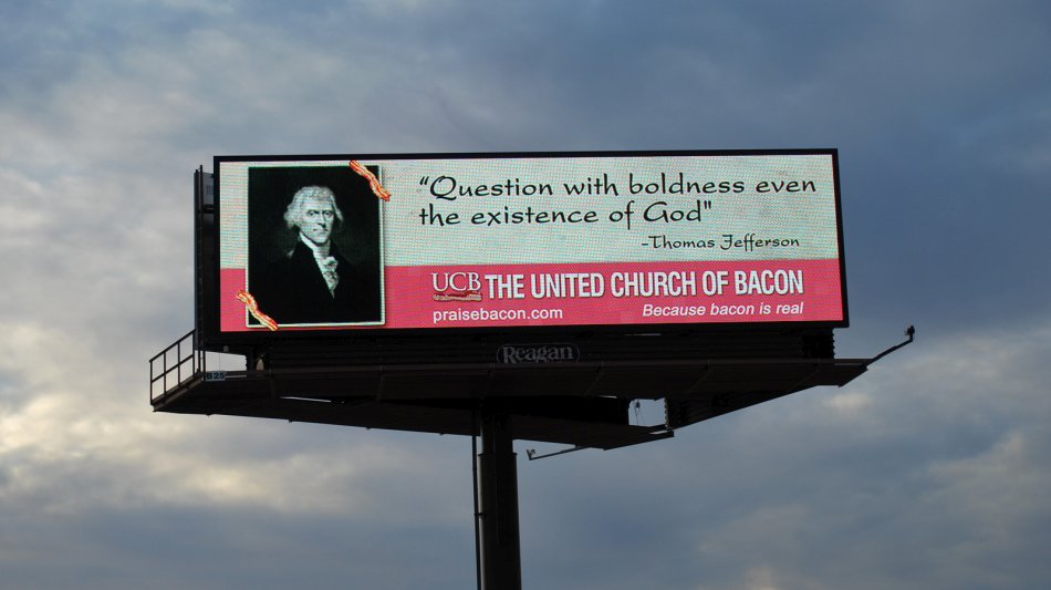 Η Ενωμένη Εκκλησία του Μπεϊκον (UCB το ακρωνύμιο στα αγγλικά ) ιδρύθηκε το 2010 από τον Τζον Γουάιτσαιντ (John Whiteside) και εδρεύει στο Nevaticano του Λας Βέγκας-γνωστή και ως «αμαρτωλή πόλη», στην Νεβάδα των ΗΠΑ, ως διαμαρτυρία για την καταπολέμηση των διακρίσεων εις βάρος των άθεων. Η εκκλησία αυτή συγκεντρώνει περίπου 4.000 οπαδούς οι οποίοι φορούν καπέλο του μπέιζμπωλ με την επιγραφή: «Δοξάστε το μπεϊκον».