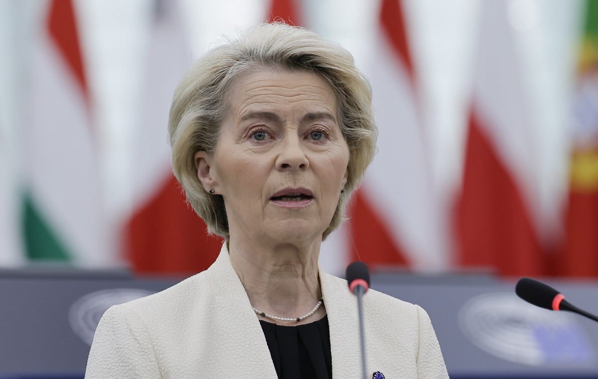 epa12079370 Ursula von der Leyen, European Commission President, speaks during a debate on 'EU support for a just, sustainable and comprehensive peace in Ukraine' at the European Parliament in Strasbourg, France, 07 May 2025. The current plenary session runs from 05 to 08 May 2025. EPA/RONALD WITTEK
