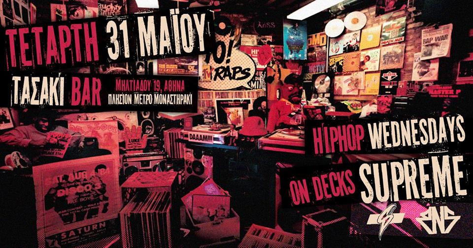 Αν ψάχνετε κάτι διαφορετικό για να περάσετε το βράδυ της Τετάρτης -η έξοδος μεσοβδόμαδα έχει γίνει must- έχουμε την καλύτερη πρόταση για εσάς. Οι Hiphop Wednesdays είναι γεγονός. Τελευταία Τετάρτη αυτού του μήνα και εμείς θα βρισκόμαστε στο Τασάκι για ακόμα μια φορά ώστε να υποδεχθούμε τη πρώτη μέρα του Ιουνίου και συνεπώς του καλοκαιριού υπο τον ήχο HipHop μουσικών επιλογών απο τον SUPREME a.k.a Πέτρος Ξαρχάς (RNS).Μαζί του ένας guest έκπληξη.