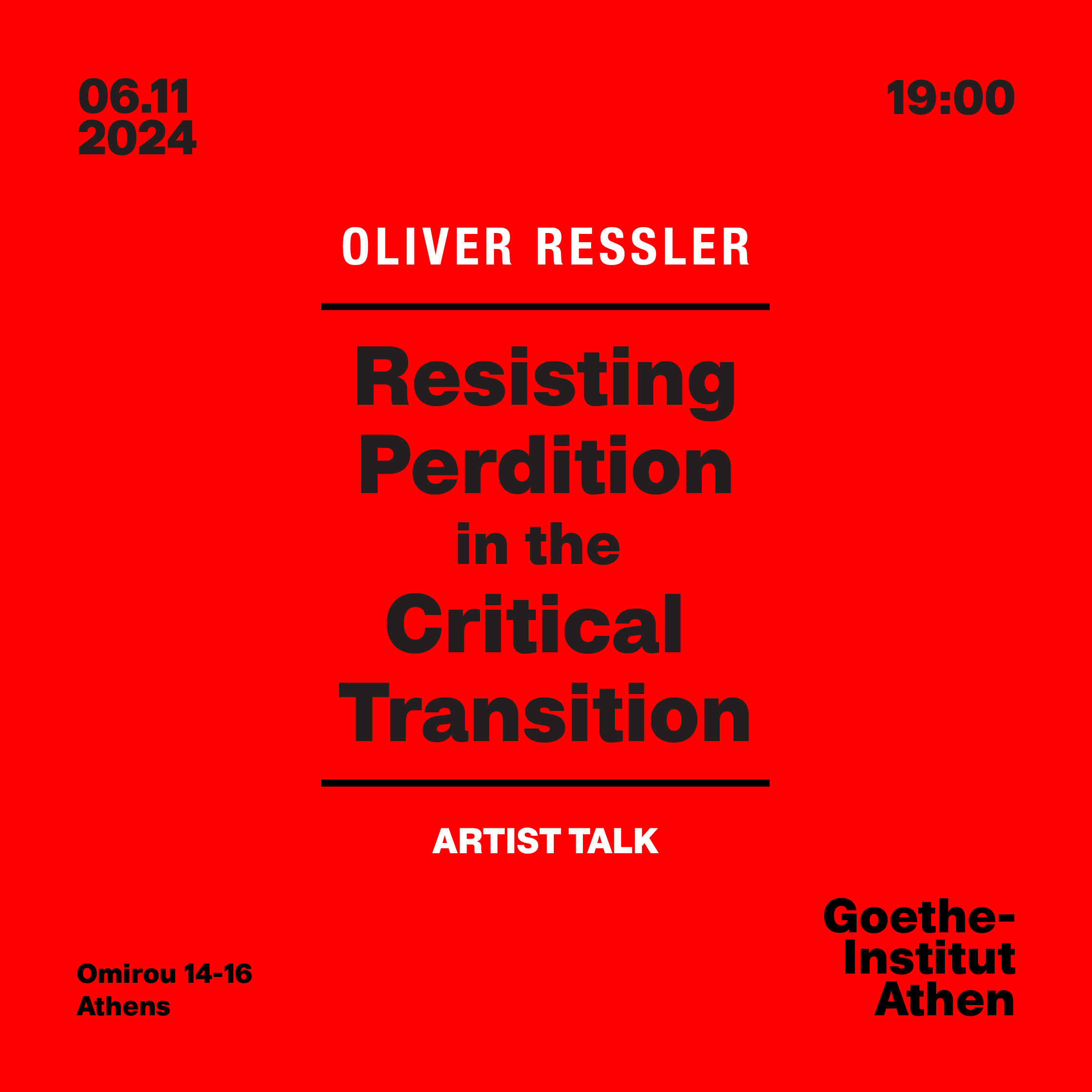 Artist talk: «Αντίσταση στον όλεθρο κατά την κρίσιμη μετάβαση». Τετάρτη 6 Νοεμβρίου 2024, 19:00 Goethe-Institut Athen
