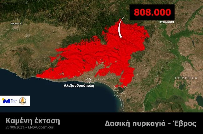 Σύμφωνα με το meteo.gr, όπως προκύπτει από την ανάλυση των δεδομένων, η συνολική έκταση που κατέκαψε η δασική πυρκαγιά του Έβρου, η οποία προέκυψε από τη συνένωση των πυρκαγιών σε Αλεξανδρούπολη και Δαδιά, ξεπερνά τα 808.000 στρέμματα (έως την 28.08.2023, 12:28 τοπική ώρα).