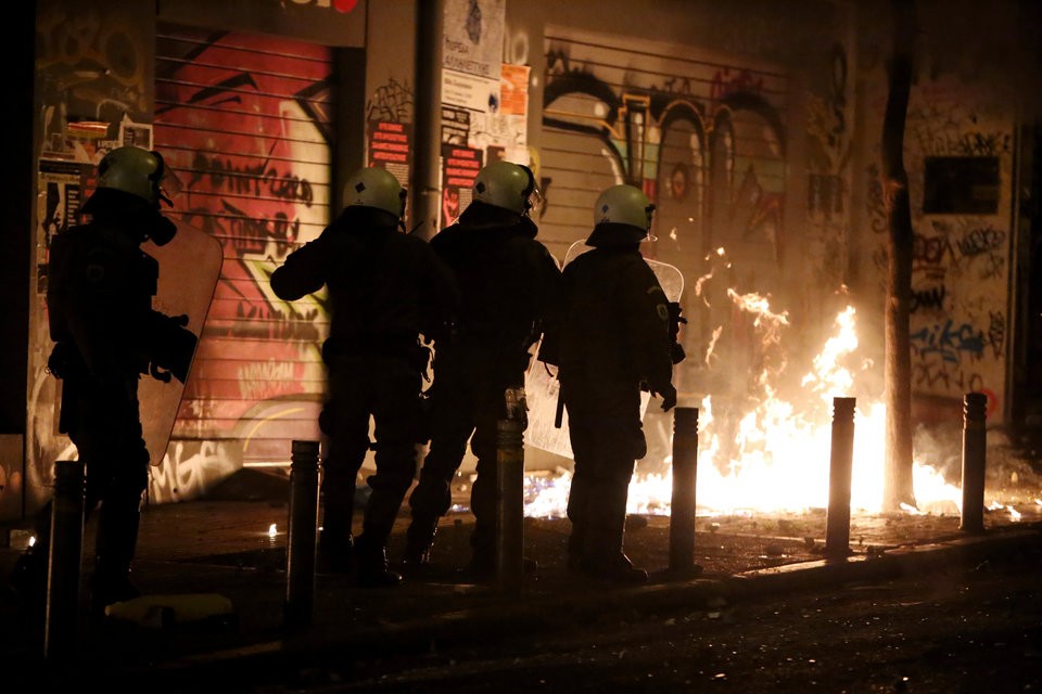 Οι αστυνομικοί, που έκαναν χρήση χημικών, τους απώθησαν και οι νεαροί κατευθύνθηκαν προς την πλατεία Εξαρχείων. Λίγη ώρα αργότερα έκαναν νέα επίθεση σε άνδρες των ΜΑΤ, με μολότοφ, πέτρες και καδρόνια, ενώ όλη η περιοχή θύμιζε «πεδίο μάχης». Είναι χαρακτηριστικό, μάλιστα, το γεγονός, ότι κάποιος πέταξε φωτοβολίδα εναντίον των αστυνομικών, η οποία, όμως, κατέληξε σε μπαλκόνι διαμερίσματος τρίτου ορόφου, στη συμβολή των οδών Στουρνάρη και Ζαΐμη. Το μπαλκόνι πήρε φωτιά και χρειάστηκε η επέμβαση της πυροσβεστικής. Σε βάρος των συλληφθέντων σχηματίστηκε ποινική δικογραφία και θα οδηγηθούν σήμερα στον εισαγγελέα Πλημμελειοδικών Αθηνών.
