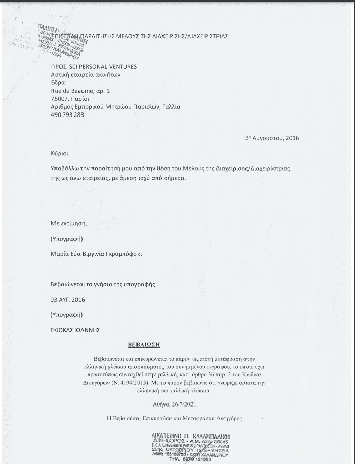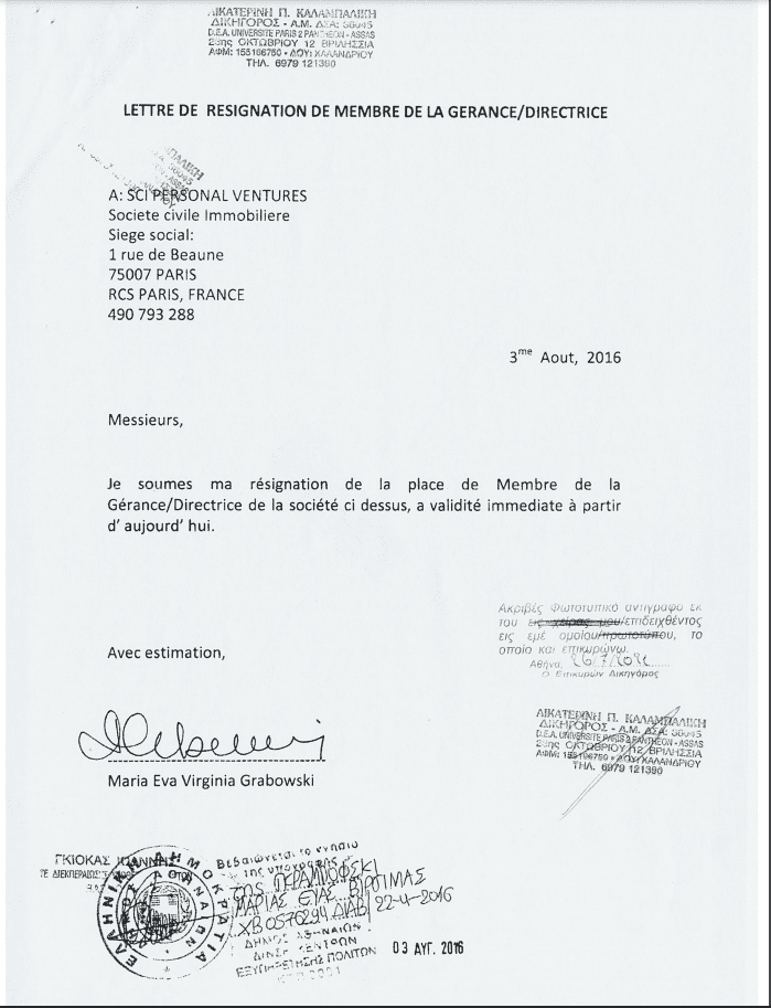 Αυτή τη φορά βέβαια η κυρία Γκραμπόφσκι πήγε ένα βήμα παραπάνω, αφού μαζί με το εξώδικο που απέστειλε, κοινοποίησε και ένα άλλο έγγραφο προκειμένου να αποδείξει την δήθεν αθωότητά της. Πρόκειται για ένα έγγραφο το οποίο φέρει επίσης ημερομηνία 3 Αυγούστου του 2016 και φέρεται να είναι επικυρωμένο. Το επίμαχο έγγραφο φέρει τίτλο «Επιστολή παραίτησης μέλους της διαχείρισης/διαχειρίστριας» από τη γαλλική εταιρεία SCI Personal Ventures και υπογράφεται από την κ. Γκραμπόφσκι. Στο έγγραφο η κ. Γκραμπόφσκι φέρεται να δηλώνει ότι: «υποβάλλω την παραίτησή μου από την θέση του Μέλους της Διαχείρισης/Διαχειρίστριας της ως άνω εταιρείας, με άμεση ισχύ από σήμερα».