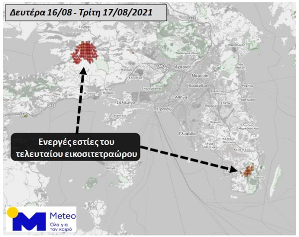 Οι ενεργές εστίες του τελευταίου 24ωρου στην Αττική σημειώνονται στην παρακάτω εικόνα. Σε αυτή φαίνονται οι εστίες δασικών πυρκαγιών που ξέσπασαν στην Αττική, όπως τις κατέγραψαν περιβαλλοντικοί δορυφόροι.