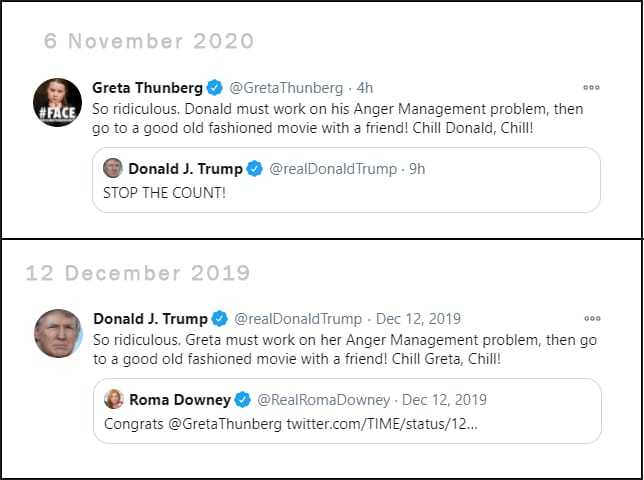 Η 17χρονη Γκρέτα σχολίασε στο Twitter, αναφερόμενη στην χθεσινή ανάρτηση του Τραμπ “ΣΤΑΜΑΤΗΣΤΕ ΤΗΝ ΚΑΤΑΜΕΤΡΗΣΗ!”: “Τόσο γελοίο. Ο Ντόναλντ θα πρέπει να δουλέψει το πρόβλημά του Διαχείρισης Θυμού και μετά να πάει να παρακολουθήσει μια παλιομοδίτικη ταινία με έναν φίλο! Χαλάρωσε Ντόναλντ, Χαλάρωσε!”.