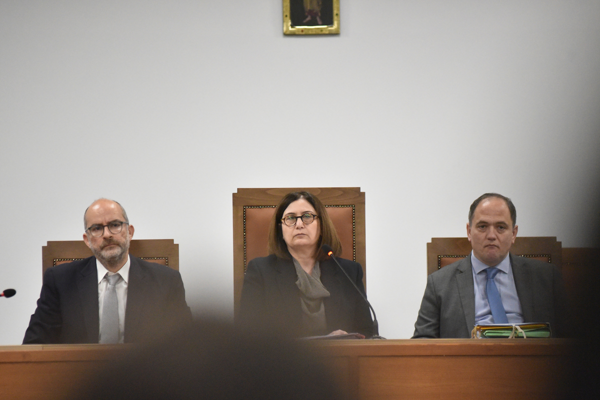Η εφέτης Γεωργία Στεφανίδου προεδρεύει στην έδρα, κατά την έναρξη της δίκης για το σιδηροδρομικό δυστύχημα στα Τέμπη που σημειώθηκε το βράδυ της 28ης Φεβρουαρίου του 2023, στην αίθουσα του Συνεδριακού Κέντρου του Πανεπιστημίου Θεσσαλίας του συγκροτήματος «ΓΑΙΟΠΟΛΙΣ», Λάρισα, Δευτέρα 23 Μαρτίου 2026. Στο δυστύχημα, όπου συγκρούστηκαν μετωπικά δύο αμαξοστοιχίες, είχε ως αποτέλεσμα να χάσουν τη ζωή τους 57 άνθρωποι, η πλειονότητα των οποίων 15 έως 25 ετών και να τραυματιστούν εκατοντάδες. Στην ειδικά διαμορφωμένη δικαστική αίθουσα θα καθίσουν 36 κατηγορούμενοι, μεταξύ των οποίων σταθμάρχες, στελέχη του ΟΣΕ, της ΕΡΓΟΣΕ, του υπουργείου Μεταφορών και της Hellenic Train. Στη δίκη θα καταθέσουν 350 μάρτυρες ενώ θα παραστούν πάνω από 200 δικηγόροι. ΑΠΕ-ΜΠΕ/ΑΠΕ-ΜΠΕ/ΑΠΟΣΤΟΛΟΣ ΝΤΟΜΑΛΗΣ