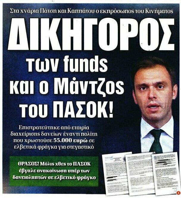 Συγκεκριμένα, ο εκπρόσωπος τύπου του ΠΑΣΟΚ-ΚΙΝΑΛ και υποψήφιος του ψηφοδελτίου Επικρατείας του κόμματος, Δημήτρης Μάντζος, βρίσκεται στο επίκεντρο του σημερινού πρωτοσέλιδου της «Δημοκρατίας», με την εφημερίδα να κάνει λόγο για «σύνδρομο Πάτση», καθώς όπως αναφέρεται στο ρεπορτάζ, επιστρατεύτηκε από fund διαχείρισης δανείων, εναντίον δανειολήπτη για χρέος 55.000 ευρώ σε ελβετικό φράγκο.