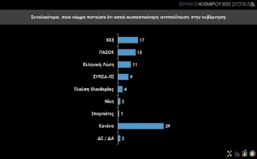 Στο ερώτημα ποιο κόμμα κάνει την ουσιαστικότερη αντιπολίτευση στην κυβέρνηση, το 39% απαντά κανένα. Το ΚΚΕ δηλώνει το 17%, το ΠΑΣΟΚ απαντά το 15%, η Ελληνική Λύση το 11%, ο ΣΥΡΙΖΑ το 9%, η Πλεύση Ελευθερίας το 4%, η Νίκη 2% και οι Σπαρτιάτες 1%.