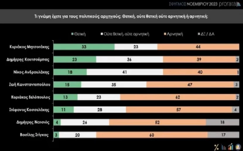 Στην ερώτηση για το τι γνώμη έχουν για τους πολιτικούς αρχηγούς, ένα 33% εκφράζει θετική γνώμη για τον πρωθυπουργό, Κυριάκο Μητσοτάκη, ο Κυριάκος Μητσοτάκης έχει 33% θετικές γνώμες. Ακολουθεί ο Δημήτρης Κουτσούμπας με 23%, ο Νίκος Ανδρουλάκης με 18%, η Ζωή Κωνσταντοπούλου με 15%, ο Κυριάκος Βελόπουλος με 13%, ο Στέφανος Κασσελάκης με 11%, ο Δημήτρης Νατσιός με 4% και τέλος ο Βασίλης Στίγκας με 3%.