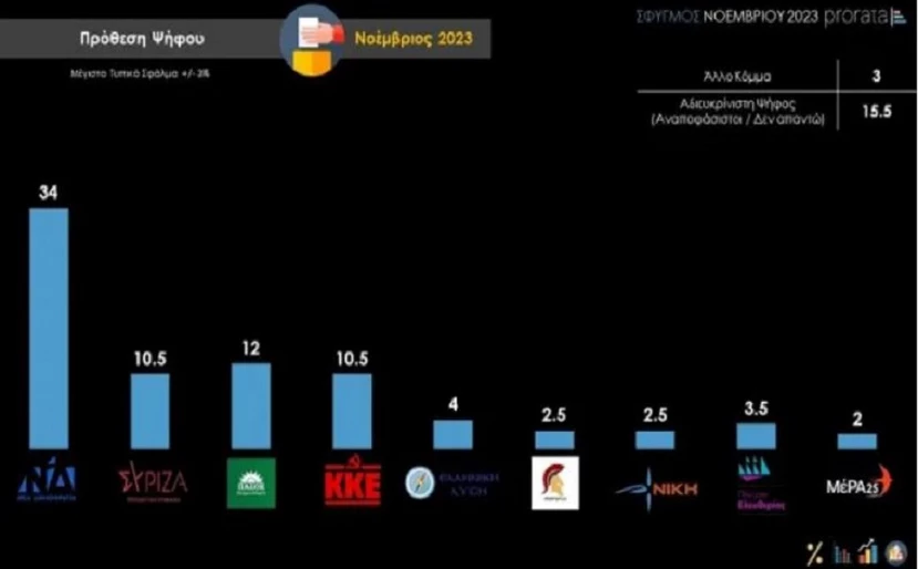 Συγκεκριμένα, στην πρόθεση ψήφου της έρευνας, η Νέα Δημοκρατία είναι πρώτη με 34%. Ακολουθεί το ΠΑΣΟΚ με 12%, ΣΥΡΙΖΑ και ΚΚΕ καταγράφουν από 10,5%. Η Ελληνική Λύση βρίσκεται στο 4%, η Πλεύση Ελευθερίας στο 3,5% και κάτω από το όριο της κοινοβουλευτικής εκπροσώπησης οι Σπαρτιάτες με 2,5% και η Νίκη με 2,5%.