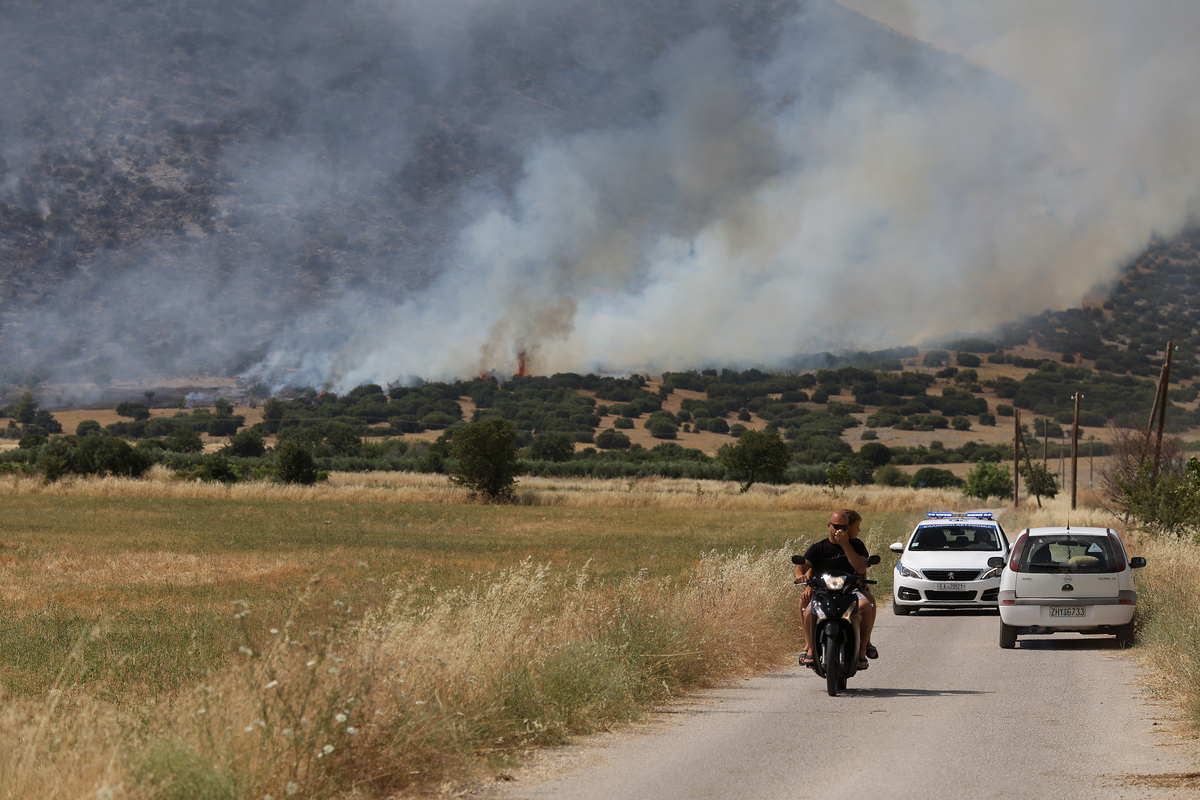 Αστυνομικοί ρυθμίζουν την κυκλοφορία σε επαρχιακό δρόμο, κατά τη διάρκεια πυρκαγιάς που καίει δασική έκταση στην Αδριανή Δράμας, Τρίτη 24 Ιουνίου 2025. Πυρκαγιά ξέσπασε σε δασική έκταση στη Χωριστή Δράμας, σε απόσταση από κατοικημένη περιοχή. Η φωτιά ξεκίνησε γύρω στη 1 μετά το μεσημέρι και αυτήν την ώρα ενεργούν για την κατάσβεσή της 63 πυροσβέστες με 16 οχήματα, τέσσερα πεζοπόρα τμήματα και από αέρος 8 αεροσκάφη και ένα ελικόπτερο. ΑΠΕ-ΜΠΕ/ΑΠΕ-ΜΠΕ/ΠΑΥΛΟΣ ΣΙΔΗΡΟΠΟΥΛΟΣ