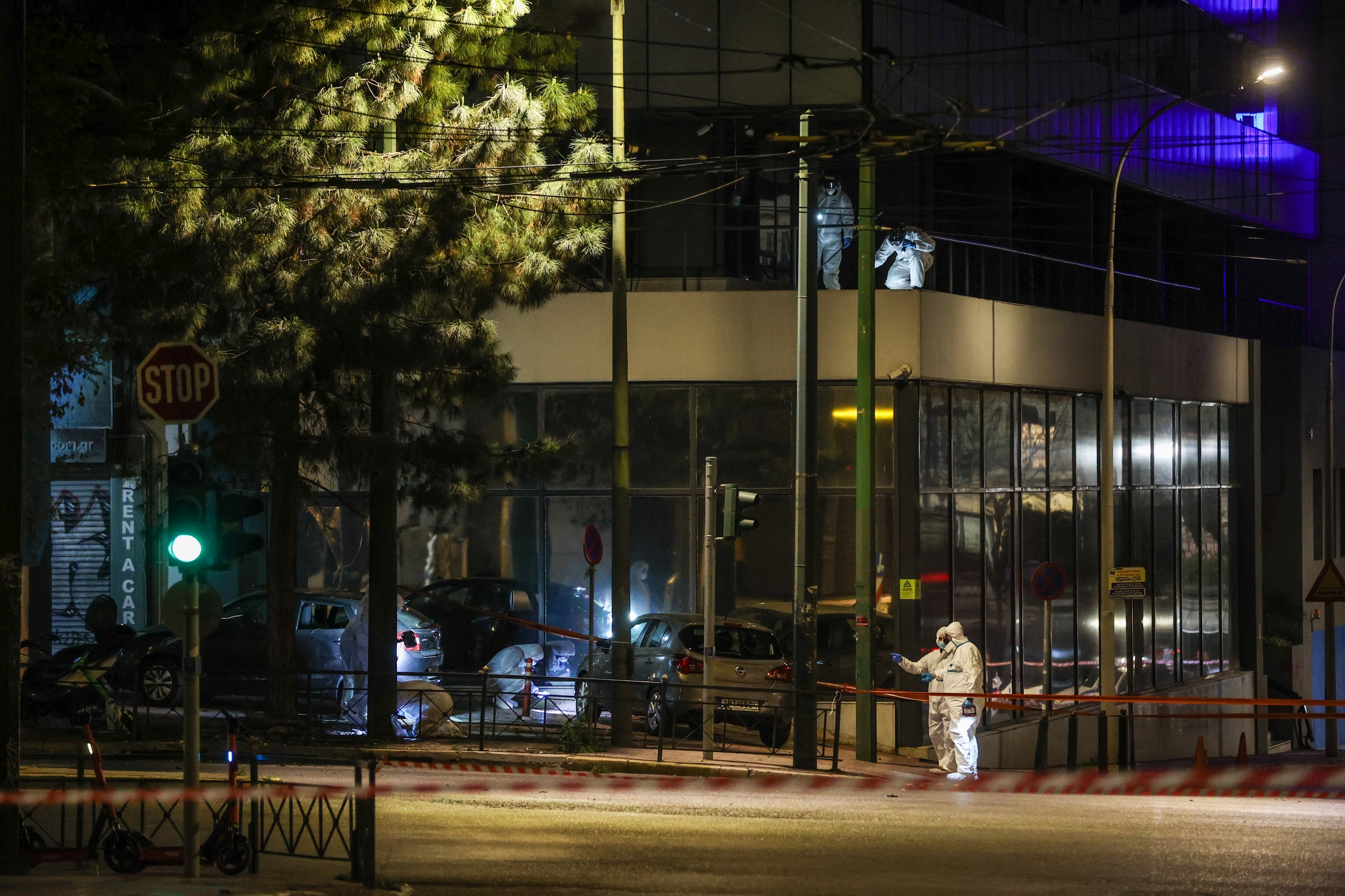 Members of the Greek police's counter-terrorism unit investigate the area outside the Hellenic Train offices after a bomb explosion, in Athens, Greece on April 11, 2025. / Μέλη της αντιτρομοκρατικής υπηρεσίας της ελληνικής αστυνομίας ερευνούν το σημείο εξω απο τα γραφεία της Hellenic Train έπειτα έκρηξη βόμβας, Αθήνα, 11 Απριλίου 2025.