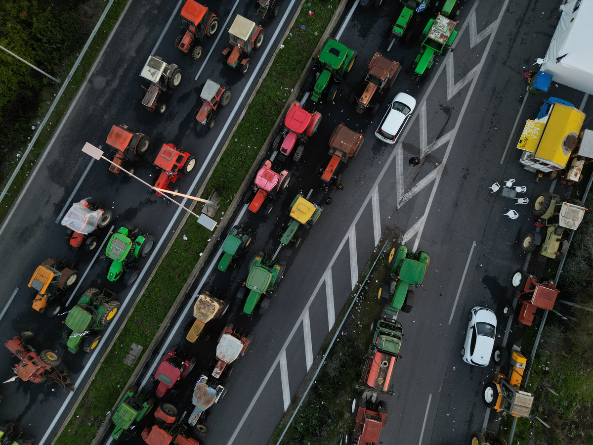 Φωτογραφία που έχει τραβηχτεί με drone και εικονίζει αγρότες με τα τρακτέρ τους πραγματοποιούν μπλόκο στην περιοχή της Νίκαιας, κατά τη διάρκεια των αγροτικών κινητοποιήσεων στη Λάρισα, Τρίτη 9 Δεκεμβρίου 2025. Χιλιάδες τρακτέρ κατακλύζουν τις Εθνικές Οδούς, αποκλείουν κομβικά σημεία απ' άκρη σ' άκρη της χώρας, ενισχύουν τα υπάρχοντα μπλόκα. ΑΠΕ-ΜΠΕ/ΑΠΕ-ΜΠΕ/ΝΙΚΟΣ ΧΑΤΖΗΠΟΛΙΤΗΣ