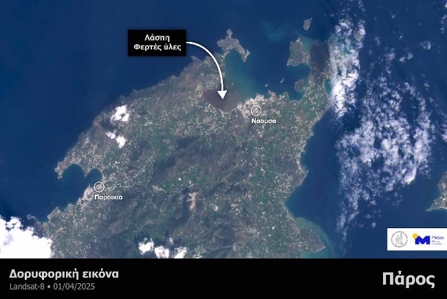 Σε δορυφορική εικόνα που προέρχεται από τον Αμερικανικό δορυφόρο Landsat-8 και επεξεργάστηκε η μονάδα METEO του Εθνικού Αστεροσκοπείου Αθηνών παρατηρείται το σημείο στην θάλασσα που κατέληξαν όλες οι φερτές ύλες και η λάσπη στην Νάουσα της Πάρου, όπου καταγράφηκαν και οι μεγαλύτερες καταστροφές.