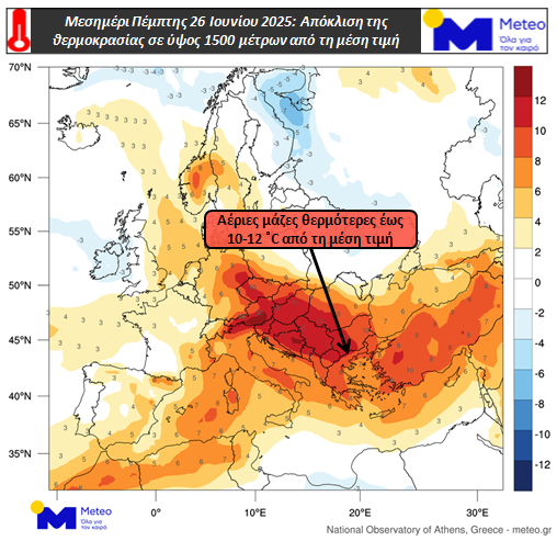Συνθήκες καύσωνα θα επικρατήσουν τοπικά, κοντά στο έδαφος, με τη μέγιστη θερμοκρασία να αναμένεται στους 39-40°C το μεσημέρι της Πέμπτης (26/06), σύμφωνα με τα τελευταία προγνωστικά δεδομένα του meteo.gr, του Εθνικού Αστεροσκοπείου Αθηνών. Η ατμοσφαιρική κυκλοφορία που επικρατεί στη Μεσόγειο και στην Ευρώπη θα έχει αποτέλεσμα την μεταφορά θερμών αερίων μαζών προς τη χώρα μας. Μάλιστα, σύμφωνα με χάρτες που παρουσιάζει το meteo.gr, η θερμοκρασία σε ύψος 1.500 μέτρων αναμένεται να είναι κατά τόπους έως και 10-12 °C υψηλότερη από τα κανονικά επίπεδα.