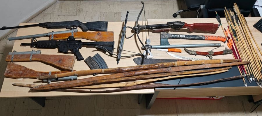 Ακολούθησε έρευνα της Αστυνομίας, όπου εντοπίστηκε ποσότητα από όπλα και σφαίρες, καθώς και αυτοσχέδια τόξα και βέλη.
