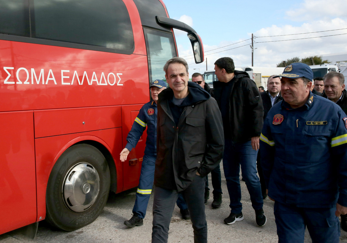 Ο πρωθυπουργός Κυριάκος Μητσοτάκης χαιρετάει μέλη της ΕΜΑΚ κατά την διάρκεια της επίσκεψής του στο Πυροσβεστικό Κλιμάκιο Θήρας και το Κινητό Επιχειρησιακό Κέντρο της Πυροσβεστικής Όλυμπος στη Σαντορίνη, Παρασκευή 7 Φεβρουαρίου 2025. ΑΠΕ-ΜΠΕ / ΟΡΕΣΤΗΣ ΠΑΝΑΓΙΩΤΟΥ