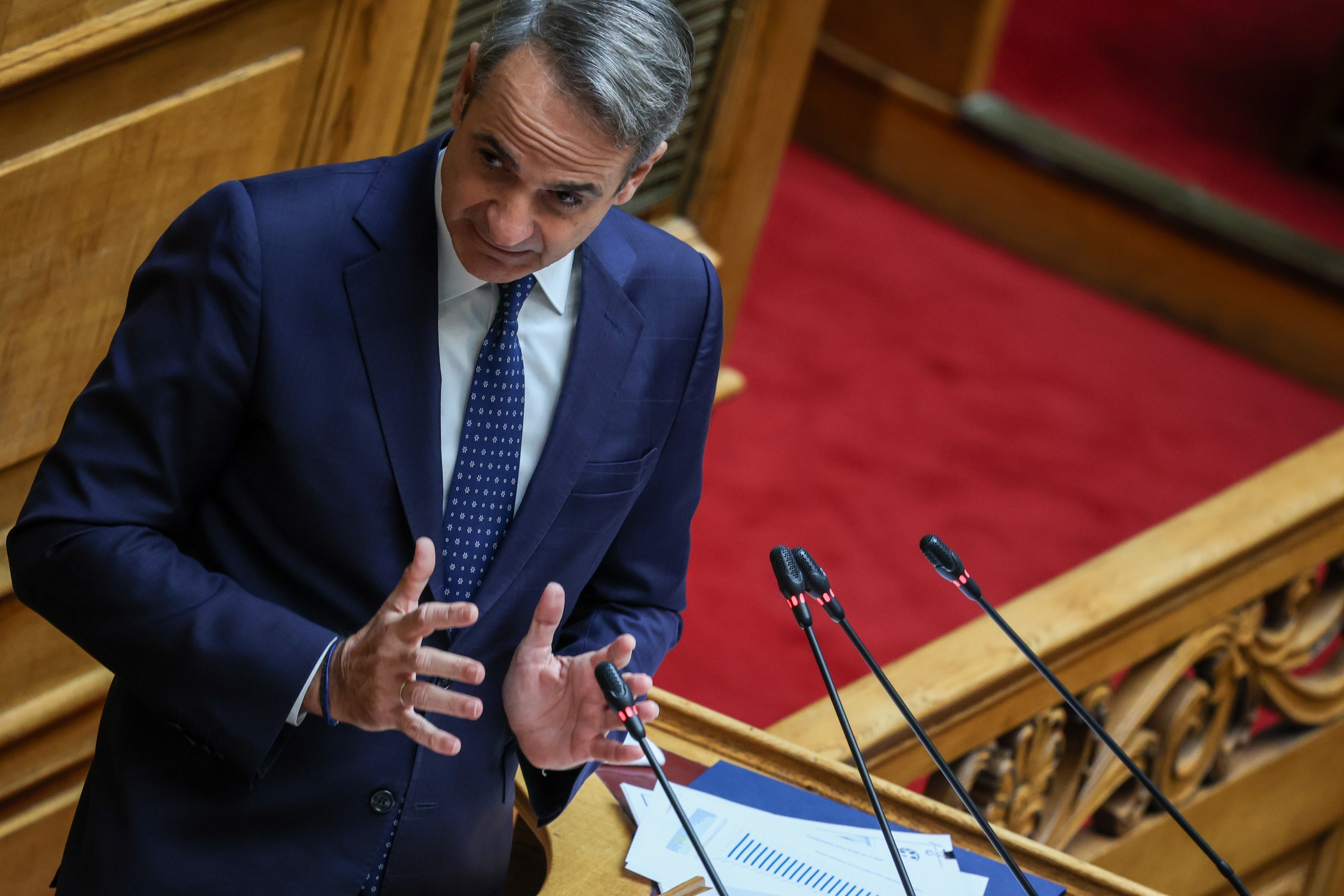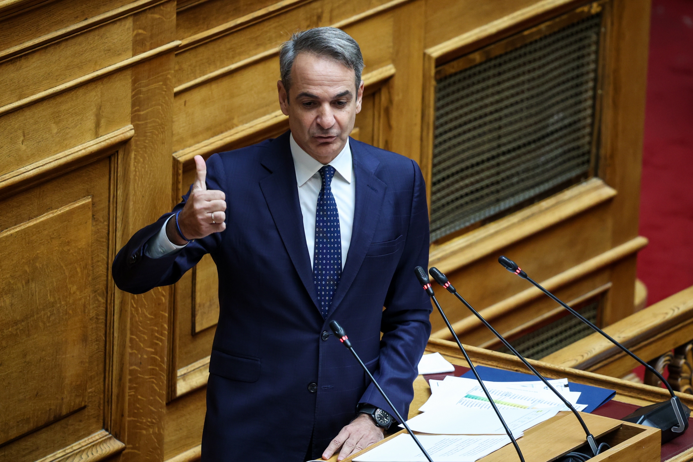 «Να σας συγχαρώ για την εφαρμογή του περιορισμού του χρόνου για τους ομιλητές», ανέφερε ο Κυριάκος Μητσοτάκης ανεβαίνοντας στο βήμα της Βουλής, απευθυνόμενος στον πρόεδρο της Βουλής Νικήτα Κακλαμάνη.