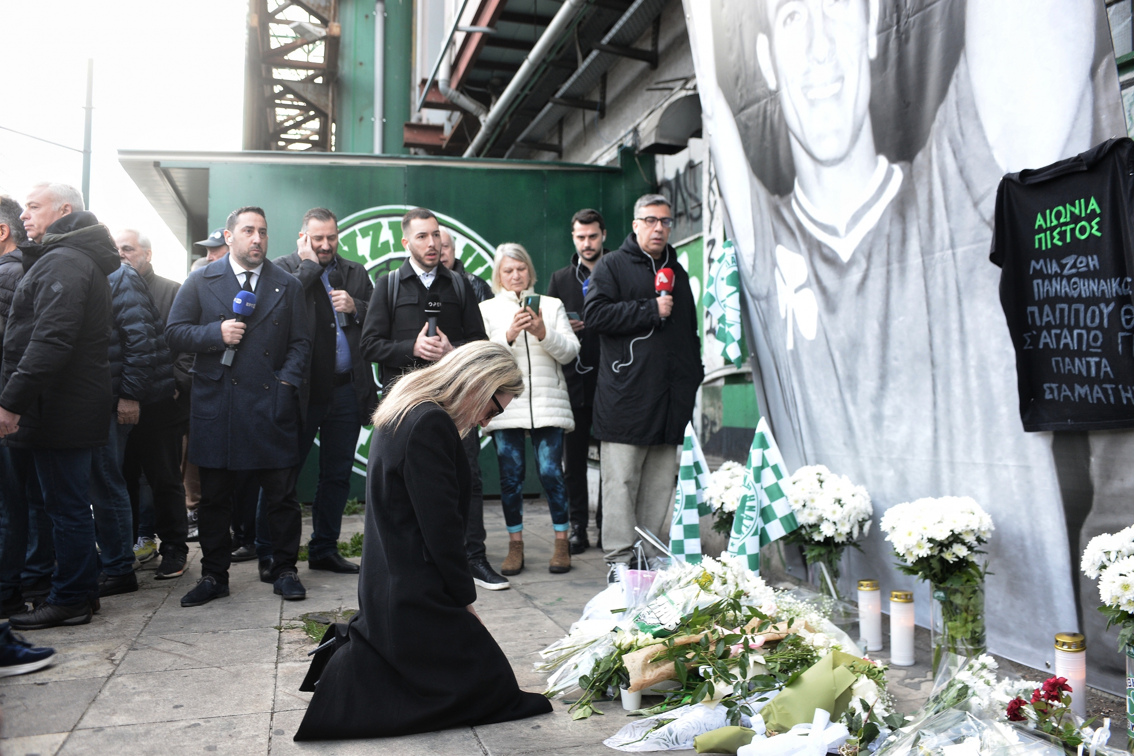 Πλήθος κόσμου, επώνυμοι κι ανώνυμοι φίλοι του Παναθηναϊκού, αλλά και του ελληνικού ποδοσφαίρου, περιμένουν υπομονετικά για τον ύστατο χαιρετισμό προς τον «Στρατηγό», τον μεγαλύτερο ποδοσφαιριστή στην Ιστορία του «τριφυλλιού», εκφράζοντας τη θλίψη τους και το σεβασμό τους με δάκρυα και λουλούδια στα χέρια.
