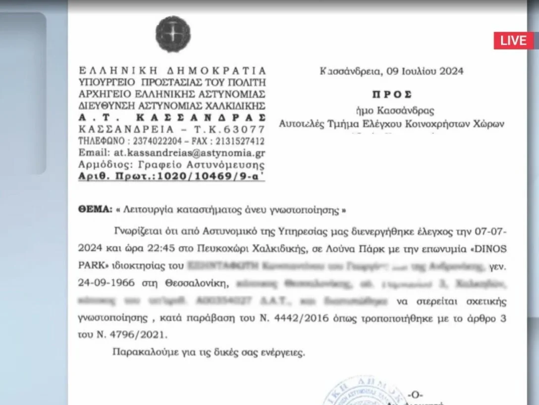 Το έγγραφο του ΑΤ Κασσανδρείας προς τον Δήμο Κασσάνδρας, επισήμαινε πως ο έλεγχος της αστυνομίας πραγματοποιήθηκε στις 7 Ιουλίου και τότε διαπιστώθηκε ότι στερείται σχετικής γνωστοποίησης.