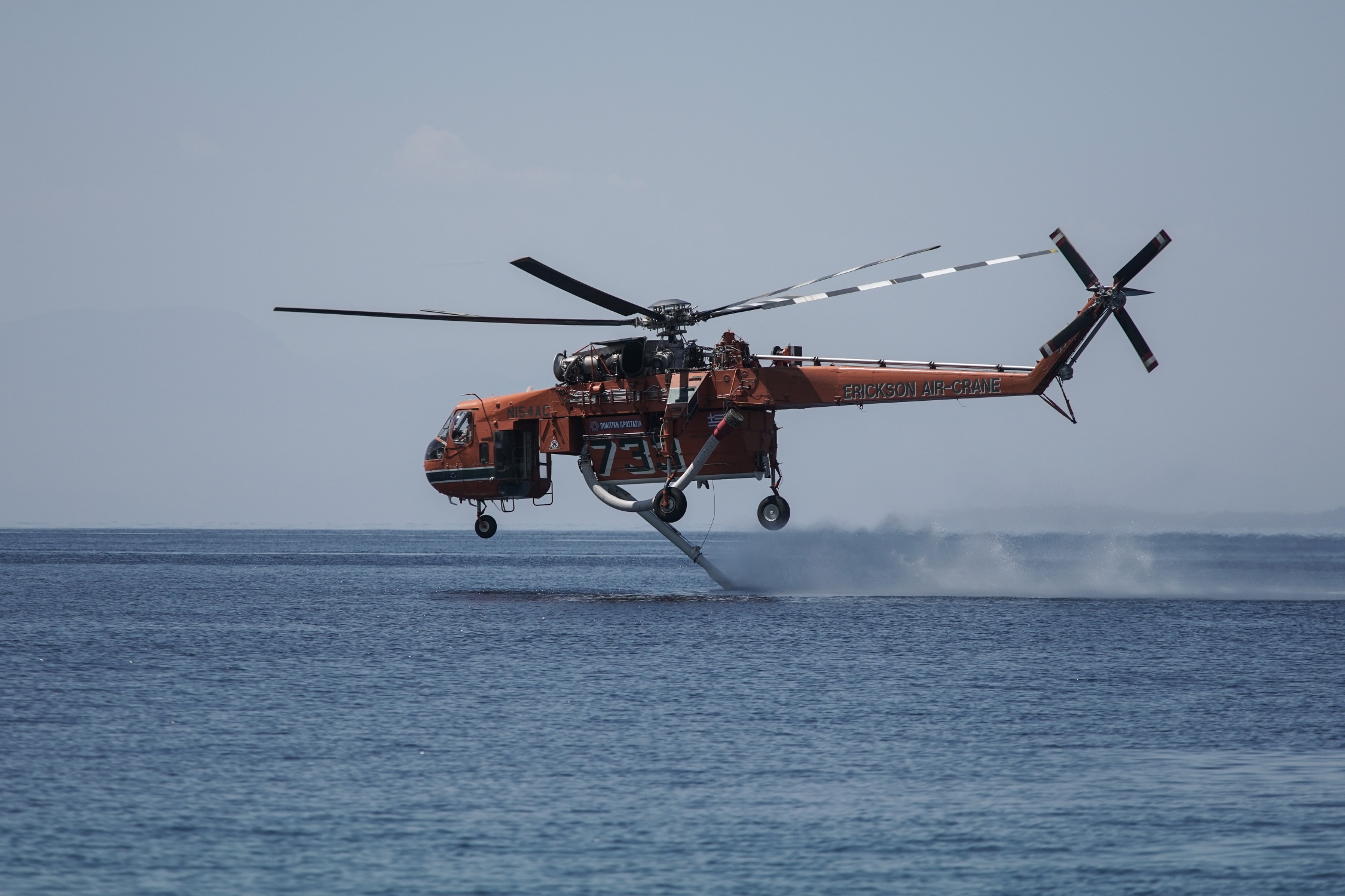 An Erickson Air-Crane S-64E collecting water from the sea of Psatha as a wildfire burns close to Vilia Attica, on August 17, 2021. / Ένα Erickson Air-Crane S-64E ανεφοδιάζετε με νερό απο την θάλασσα στην παραλία της Ψάθας, καθώς η πυρκαγιά καίει κοντά στα Βίλια, Αττικής, 17 Αυγούστου 2021