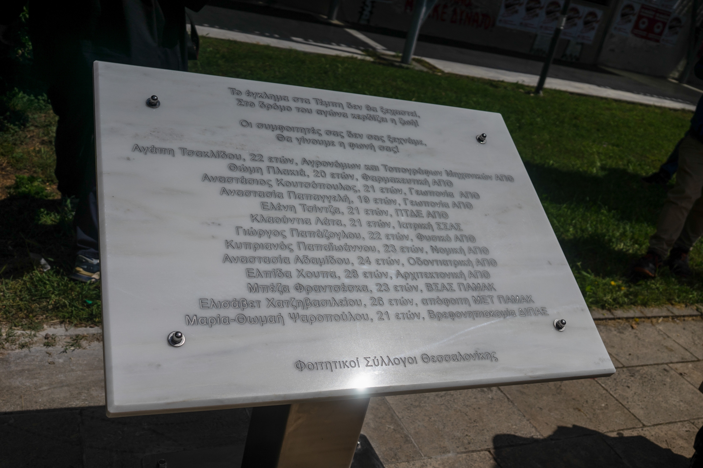Μνημείο για τους συμφοιτητές/τριες τους που έχασαν τη ζωή τους στο σιδηροδρομικό δυστύχημα των Τεμπών, τοποθέτησαν, στον αύλειο χώρο έξω από το κτίριο της Φιλοσοφικής Σχολής του Αριστοτελείου Πανεπιστημίου Θεσσαλονίκης, οι φοιτητικοί σύλλογοι των Τμημάτων Μαθηματικού, Φυσικού, Χημικού, Βιολογικού, Γεωλογικού, Ηλεκτρολόγων-Μηχανολόγων Μηχανικών, Χωροταξίας, Χημικών Μηχανικών, Αρχιτεκτονικής, Γεωπονίας, Δασολογίας, Ιατρικής, Φαρμακευτικής, ΠΤΔΕ, ΜΜΕ και ΣΟΦΕΘ.