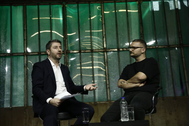 Ο πρόεδρος του ΠΑΣΟΚ-Κινήματος Αλλαγής, Νίκος Ανδρουλάκης, συνομιλεί με τον σεναριογράφο Παναγιώτη Μαρκεζίνη κατά τη διάρκεια της παρουσίασης της στεγαστικής πολιτικής του ΠΑΣΟΚ-Κινήματος Αλλαγής, στο Art Factory, στον Ταύρο, την Πέμπτη 3 Απριλίου 2025. , την Πέμπτη 3 Απριλίου 2025. ΑΠΕ-ΜΠΕ/ΠΑΣΟΚ ΚΙΝΑΛ/ΔΗΜΗΤΡΗΣ ΙΩΑΝΝΟΥ