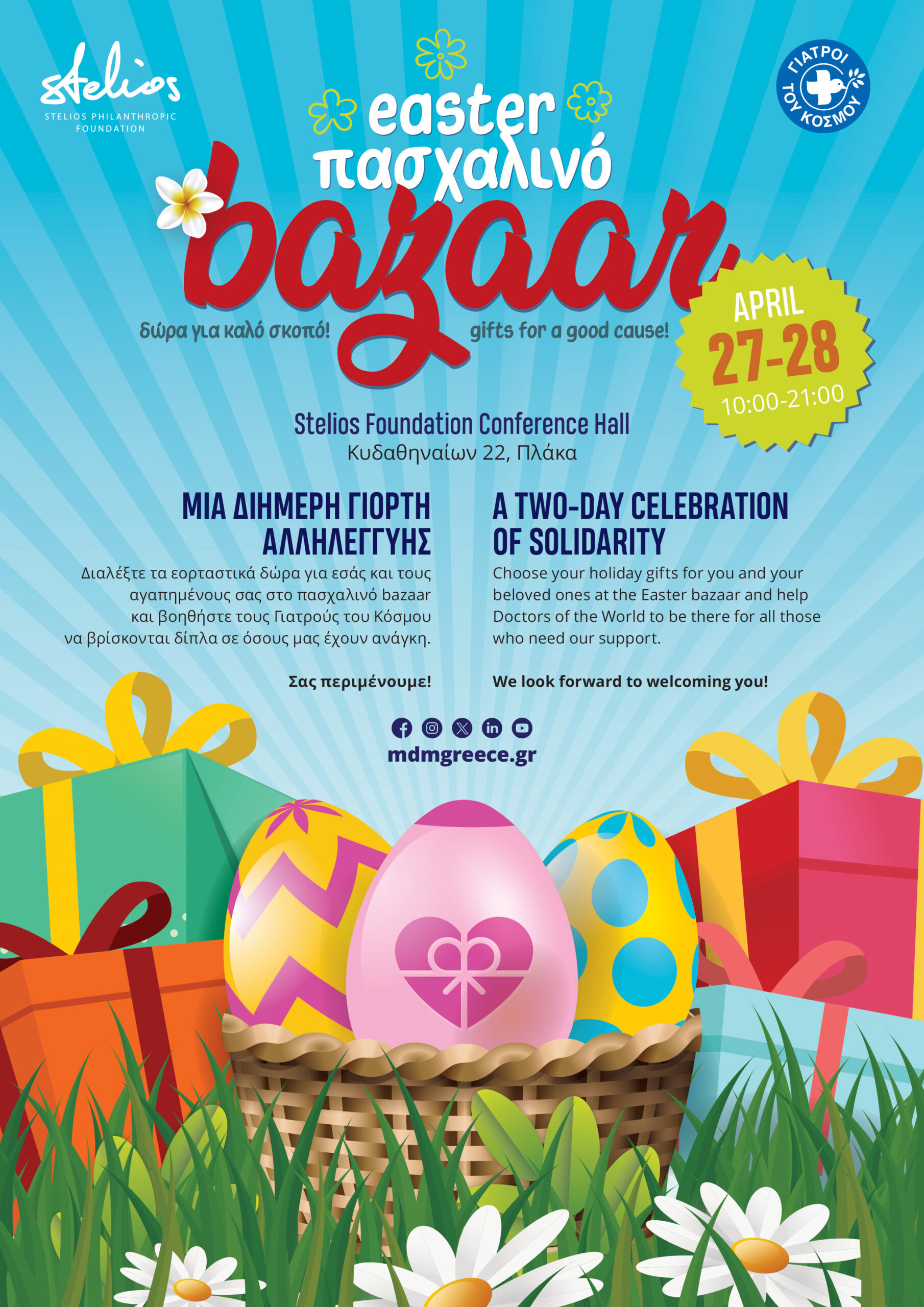 Οι Γιατροί του Κόσμου αυτό το Πάσχα στήνουν μια διήμερη γιορτή αλληλεγγύης και τo Σαββατοκύριακο 27-28 Απριλίου σας περιμενουν στο Stelios Conference Hall – Cine Paris (Κυδαθηναίων 22, στην Πλάκα), από τις 10.00 έως τις 21.00, με μοναδικά δώρα και εκπλήξεις.