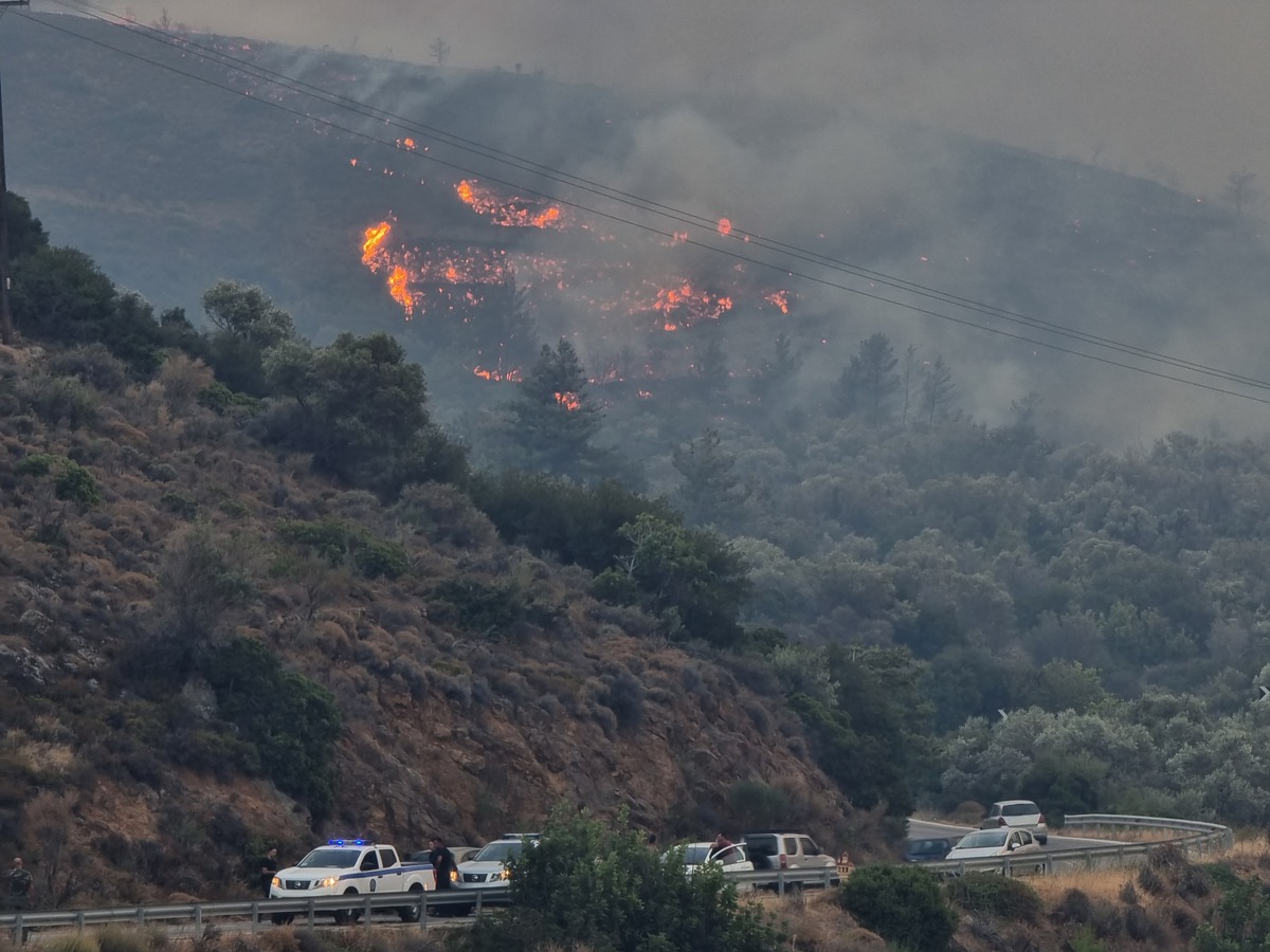 Δύσκολες οι συνθήκες που επικρατούν υψηλές θερμοκρασίες και ισχυροί θερμοί άνεμοι που ευνοούν την ταχεία εξάπλωση, ένας πολίτης υπέστη ελαφρά εγκαύματα.